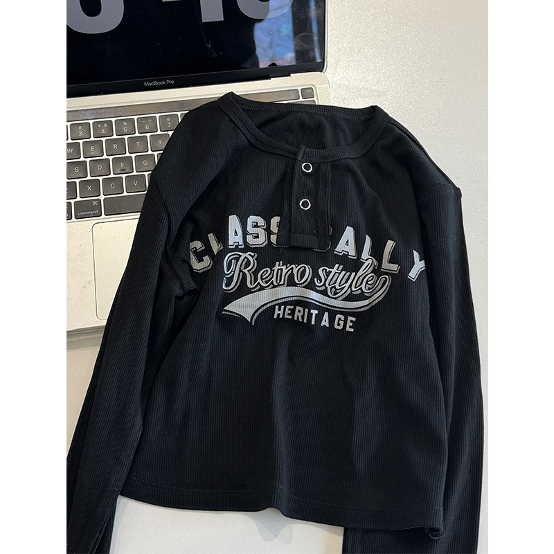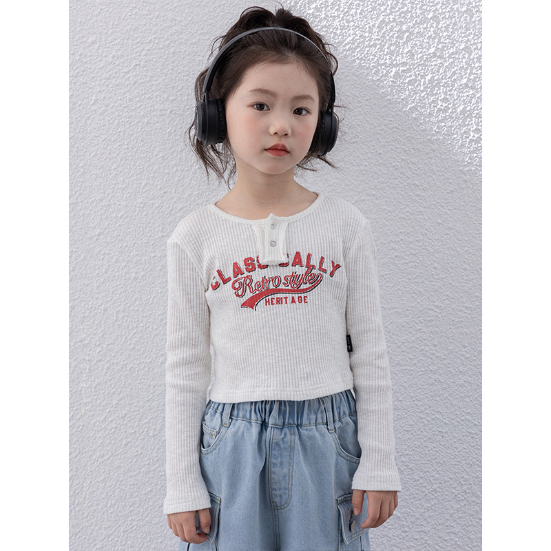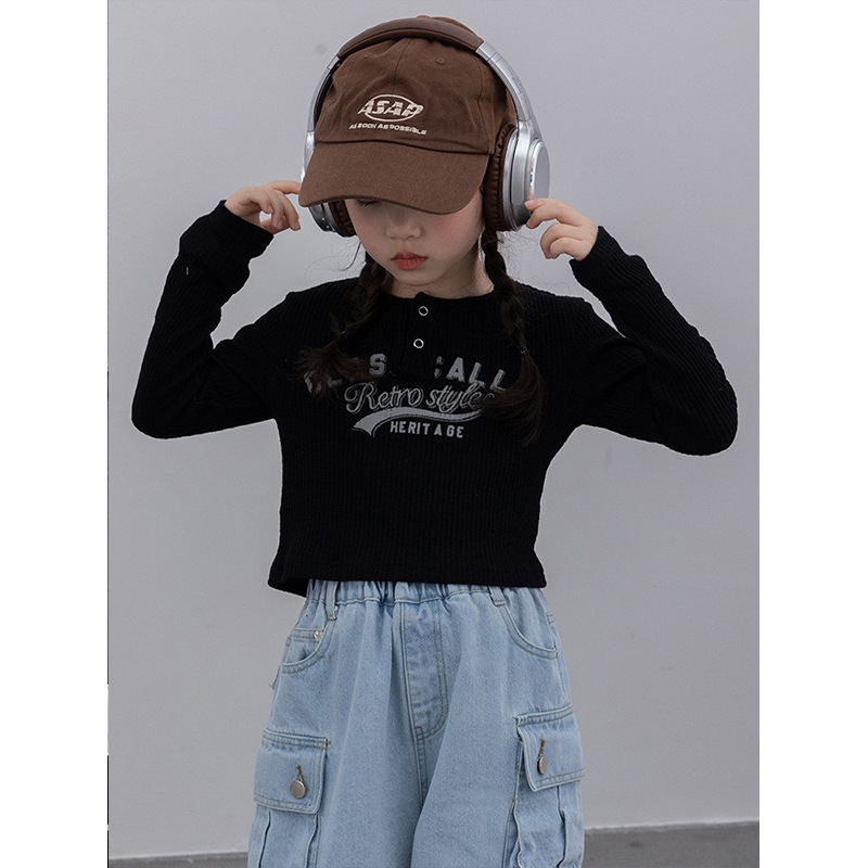 아동용 긴팔 티셔츠 2025 가을 스타일 여아 패셔너블한 짧은 레터 밑단 셔츠, 중대형 아동 캐주얼 다용도 상의