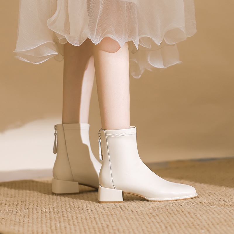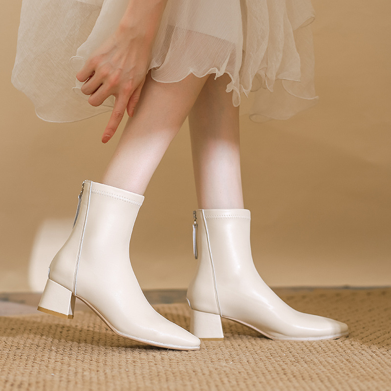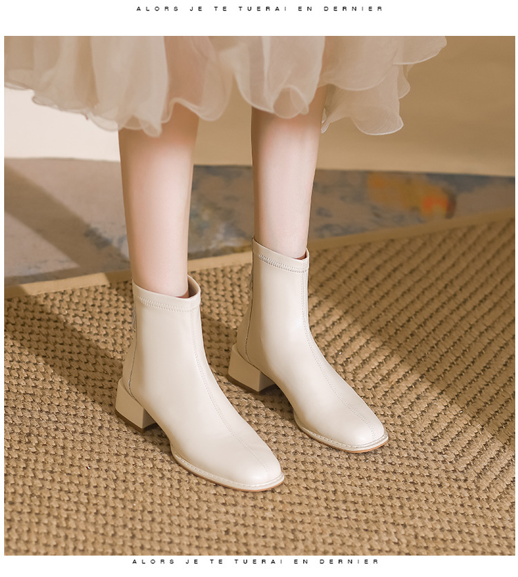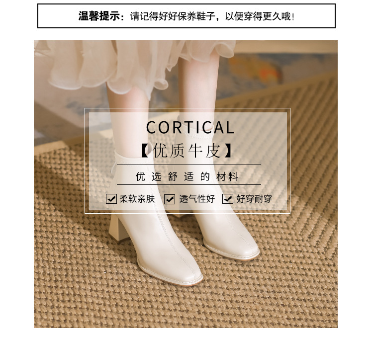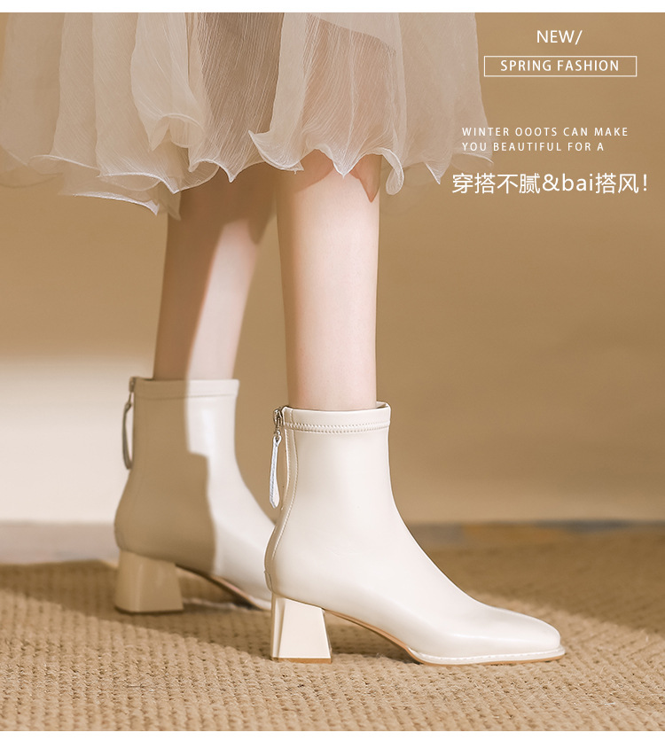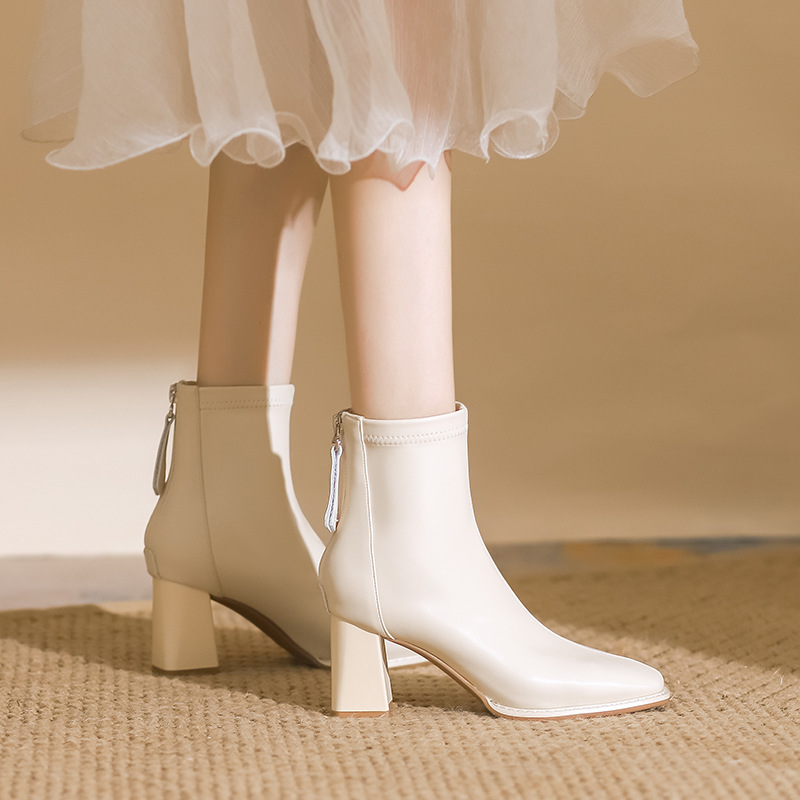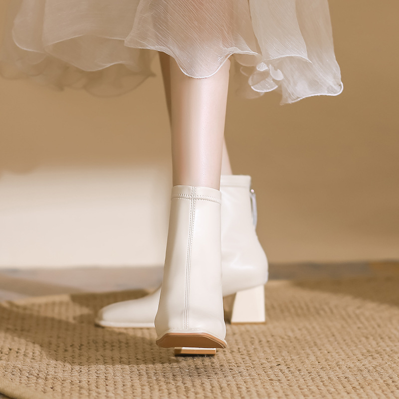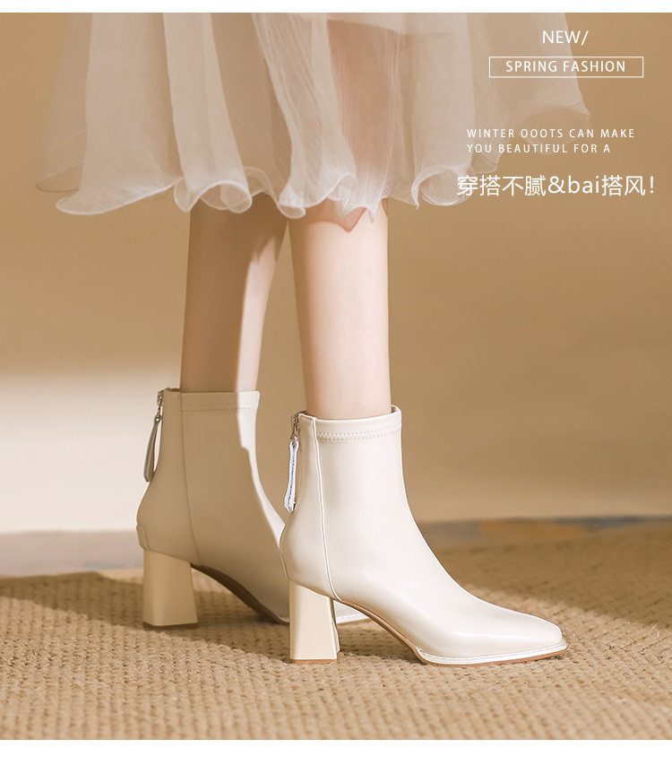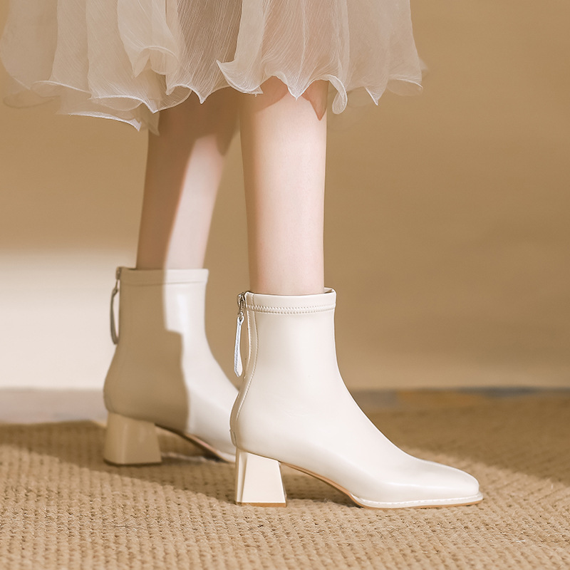 신유다 ~ 정품 가죽 흰색 발목 부츠 여성용 얇은 부츠 작은 하이힐 부츠 봄과 가을 발목 부츠 두꺼운 발 뒤꿈치 사각형 발가락 말스토어 가기