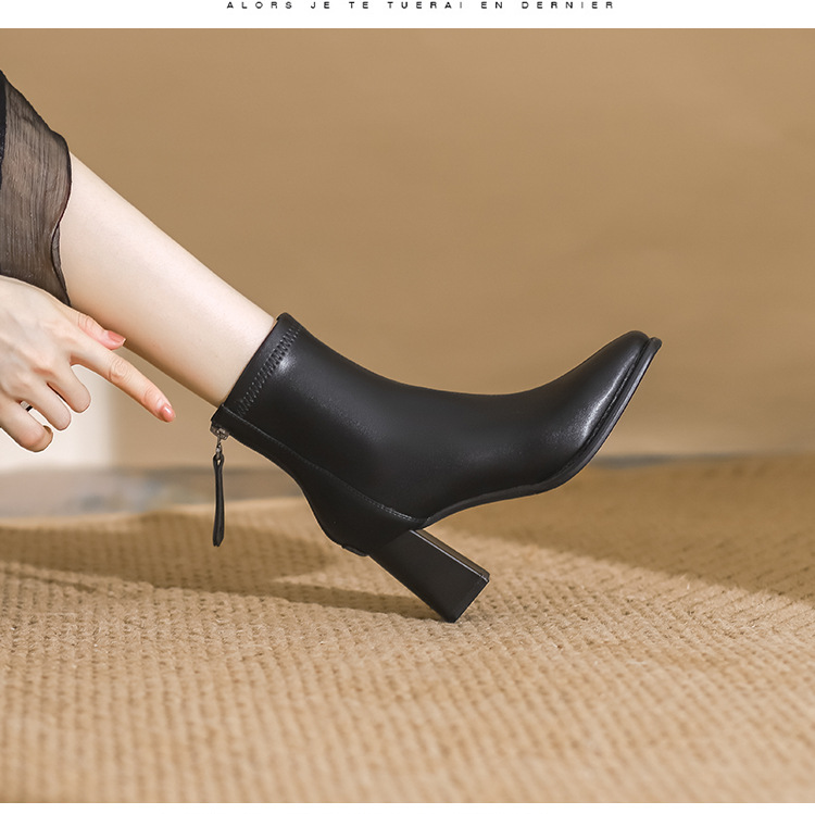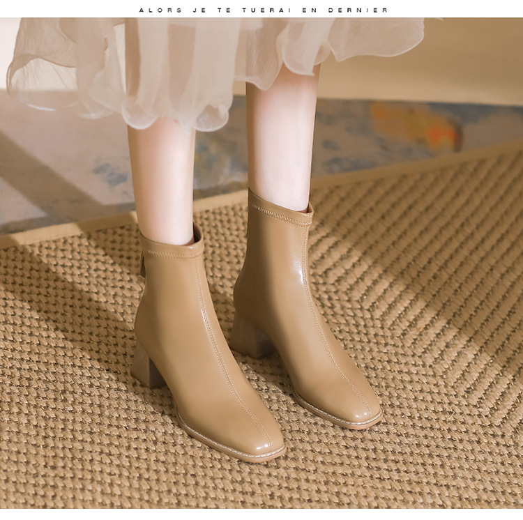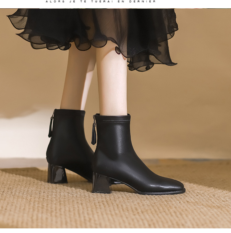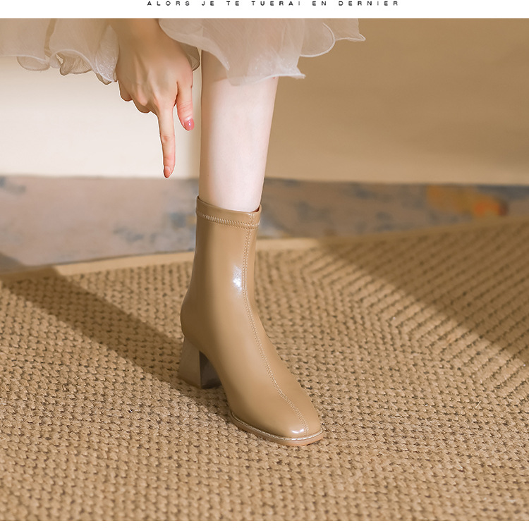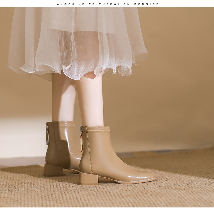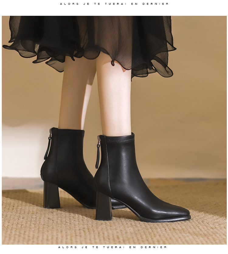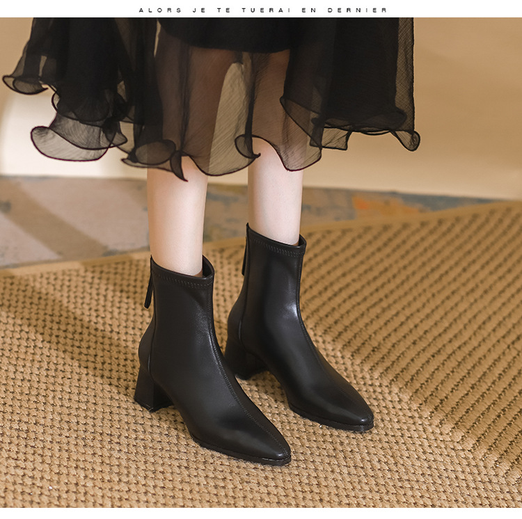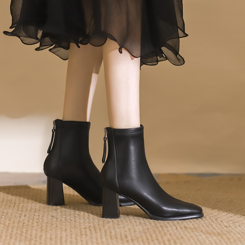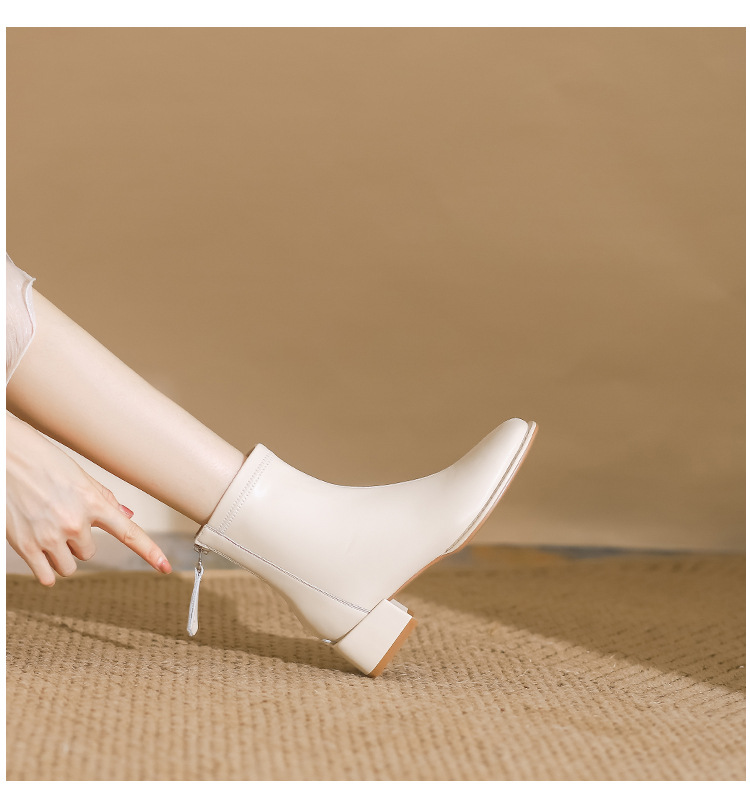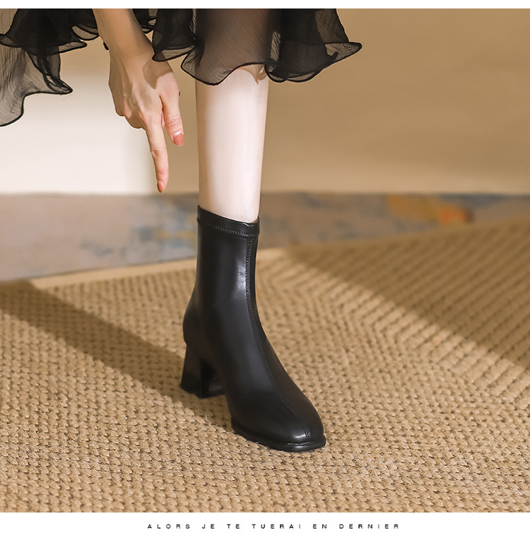 신유다 ~ 정품 가죽 흰색 발목 부츠 여성용 얇은 부츠 작은 하이힐 부츠 봄과 가을 발목 부츠 두꺼운 발 뒤꿈치 사각형 발가락 말스토어 가기