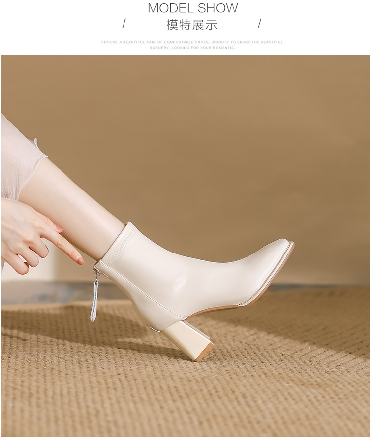 신유다 ~ 정품 가죽 흰색 발목 부츠 여성용 얇은 부츠 작은 하이힐 부츠 봄과 가을 발목 부츠 두꺼운 발 뒤꿈치 사각형 발가락 말