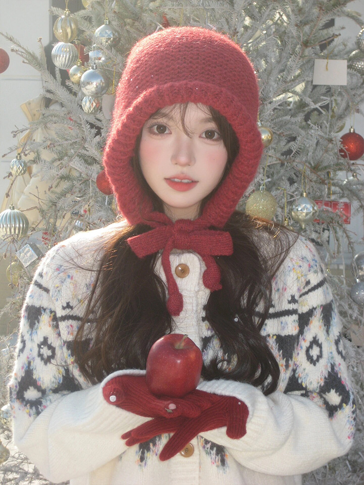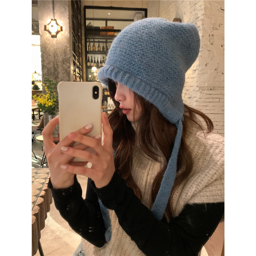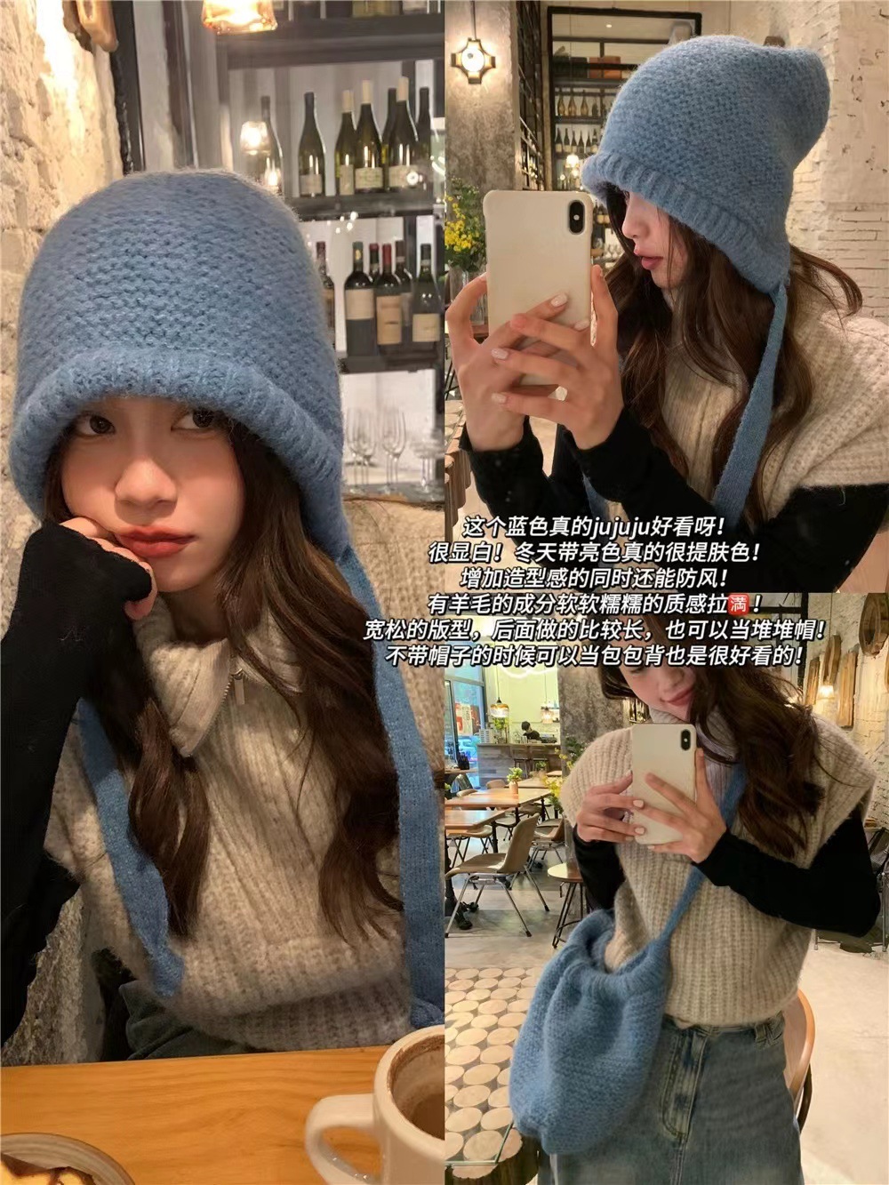 이중 사용 가방 모자 ~ 게으른 느낌 가을과 겨울 따뜻한 올 매치 울 모자 모헤어 레이스 업 니트 풀오버 모자 여성용스토어 가기