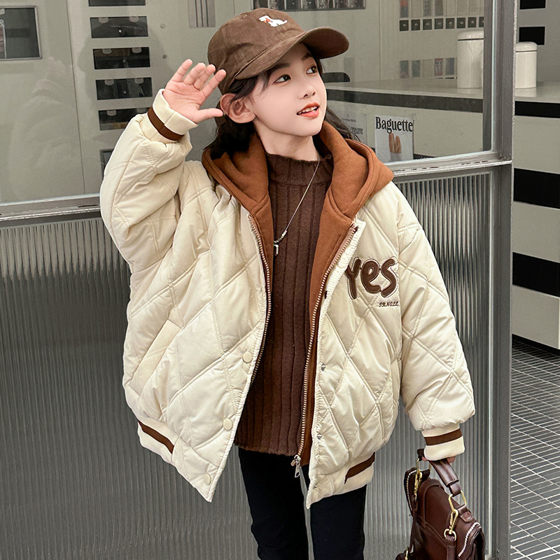 겨울 어린이 소녀들의 두꺼운면 패딩 재킷 짧은 퀼트 재킷 가짜 투피스 후드 다이아몬드 모양의 격자 무늬 따뜻한면 패딩 재킷스토어 가기