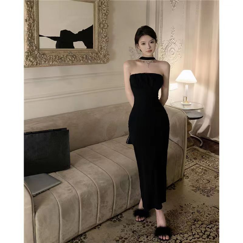 검은 매달려 목 원피스 여름 순수한 욕망 스파이스 소녀 원피스 섹시한 활 작은 슬림 핏 쉬스 스플릿 스커트스토어 가기