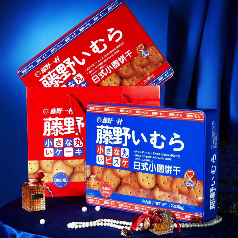 후지노 마을 일본 작은 둥근 비스킷 228g 철 박스형 바다 소금 짠 새해 선물 웨딩 스낵 도매
