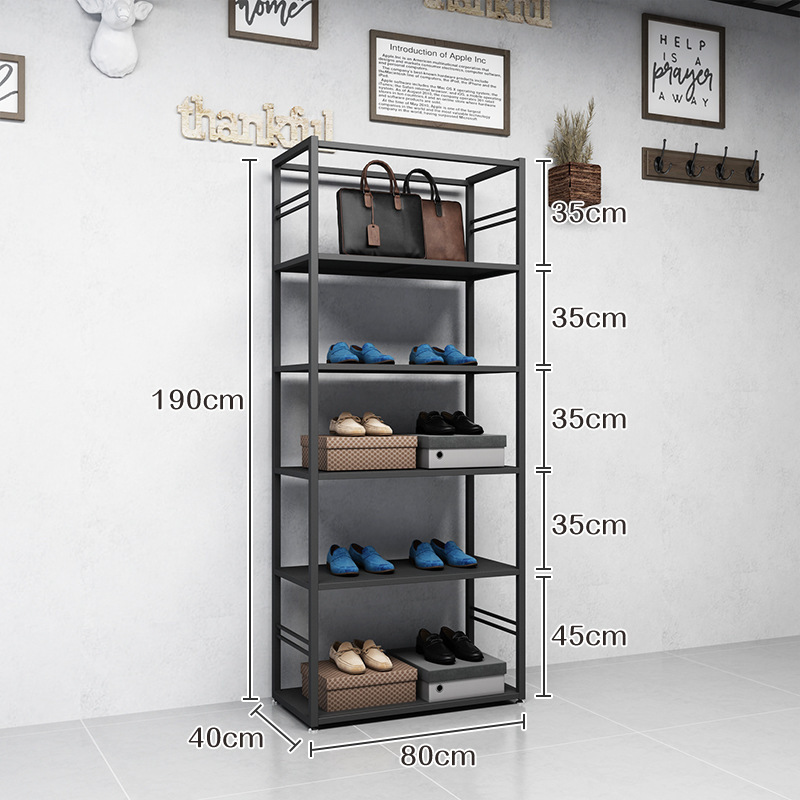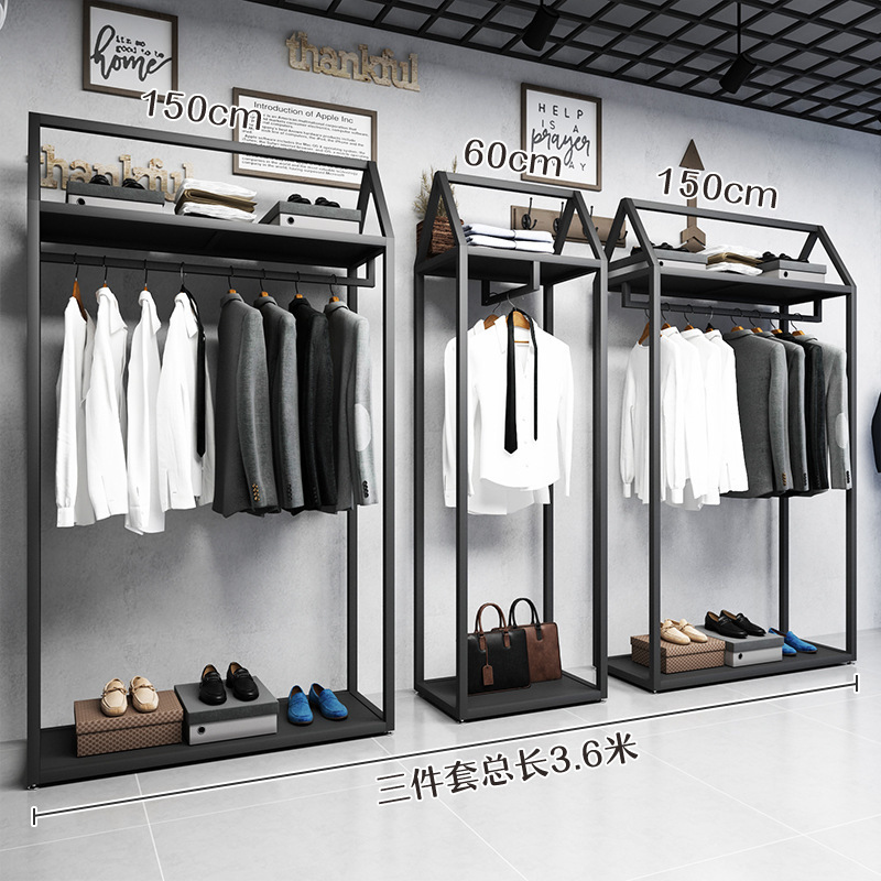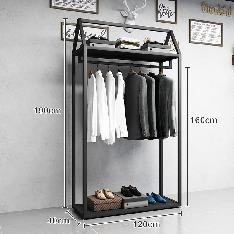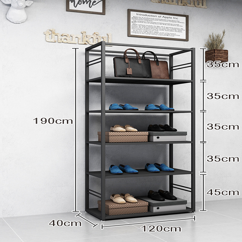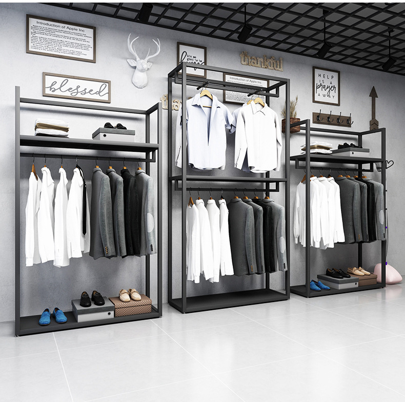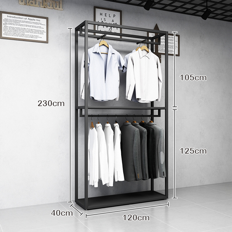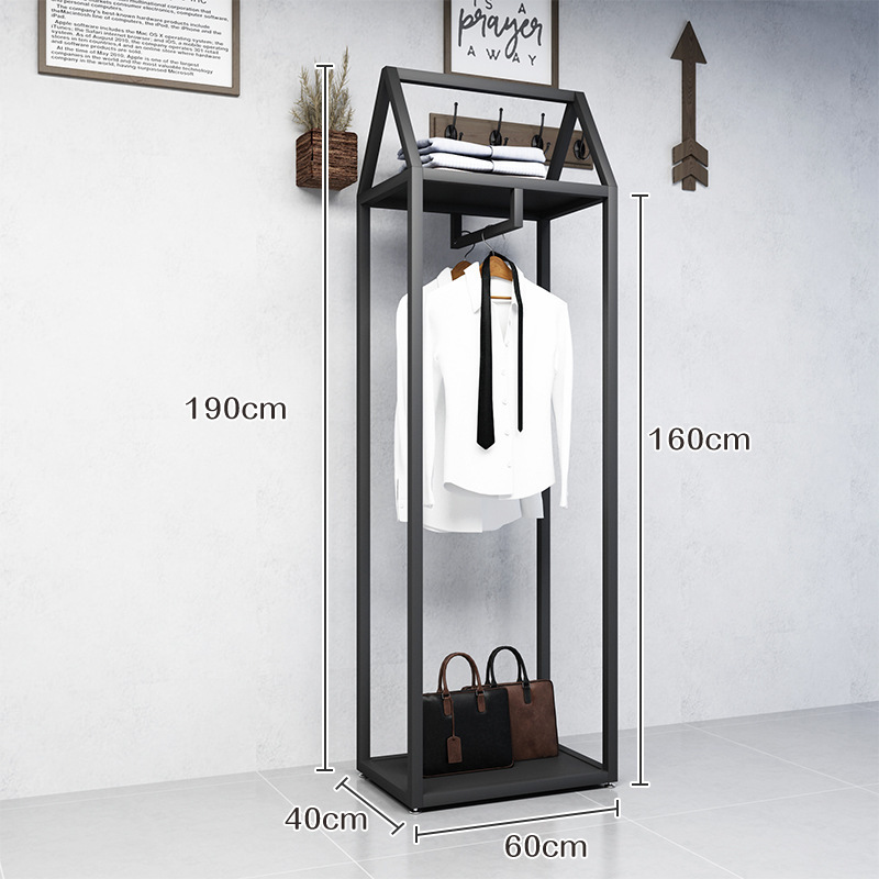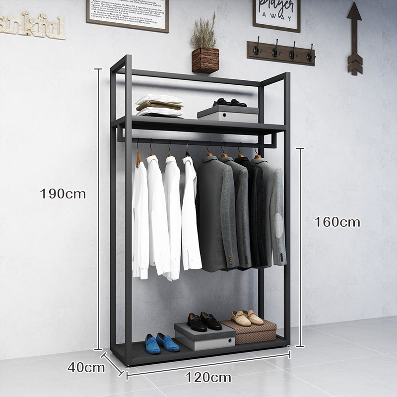 블랙 의류 매장 디스플레이 스탠드 남성 매장 선반 바닥 형 더블 레이어 디스플레이 걸이 철 금속 가방 랙스토어 가기