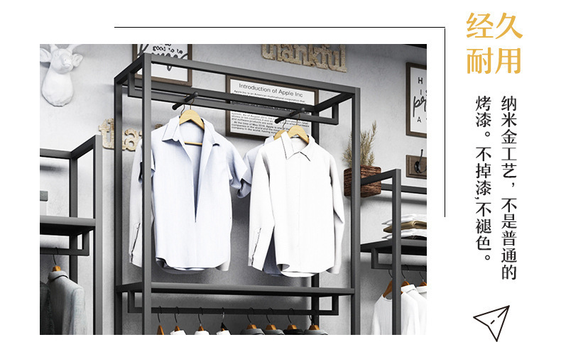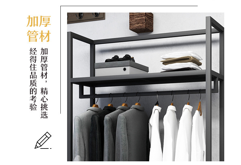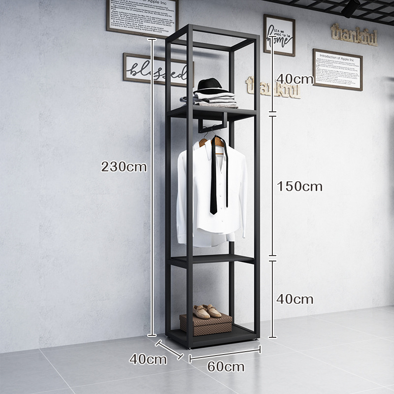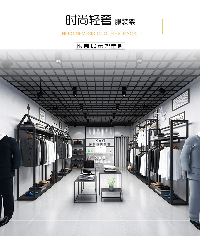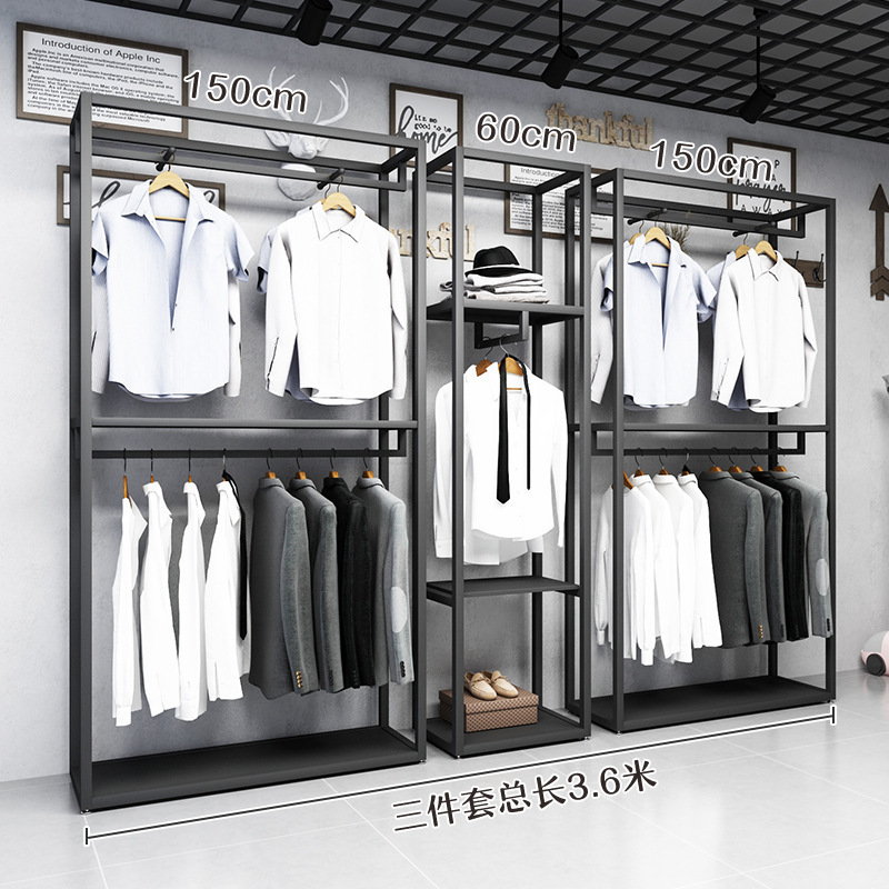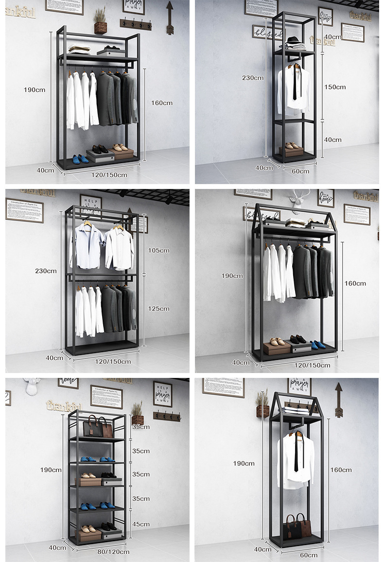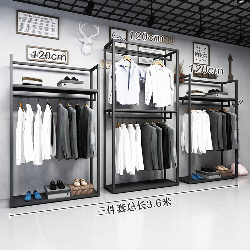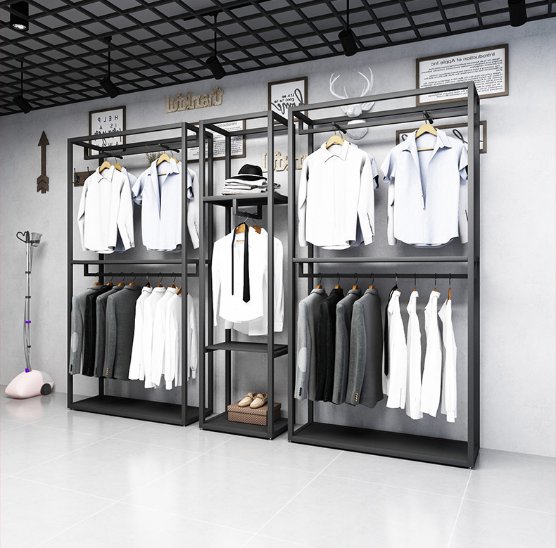 블랙 의류 매장 디스플레이 스탠드 남성 매장 선반 바닥 형 더블 레이어 디스플레이 걸이 철 금속 가방 랙스토어 가기