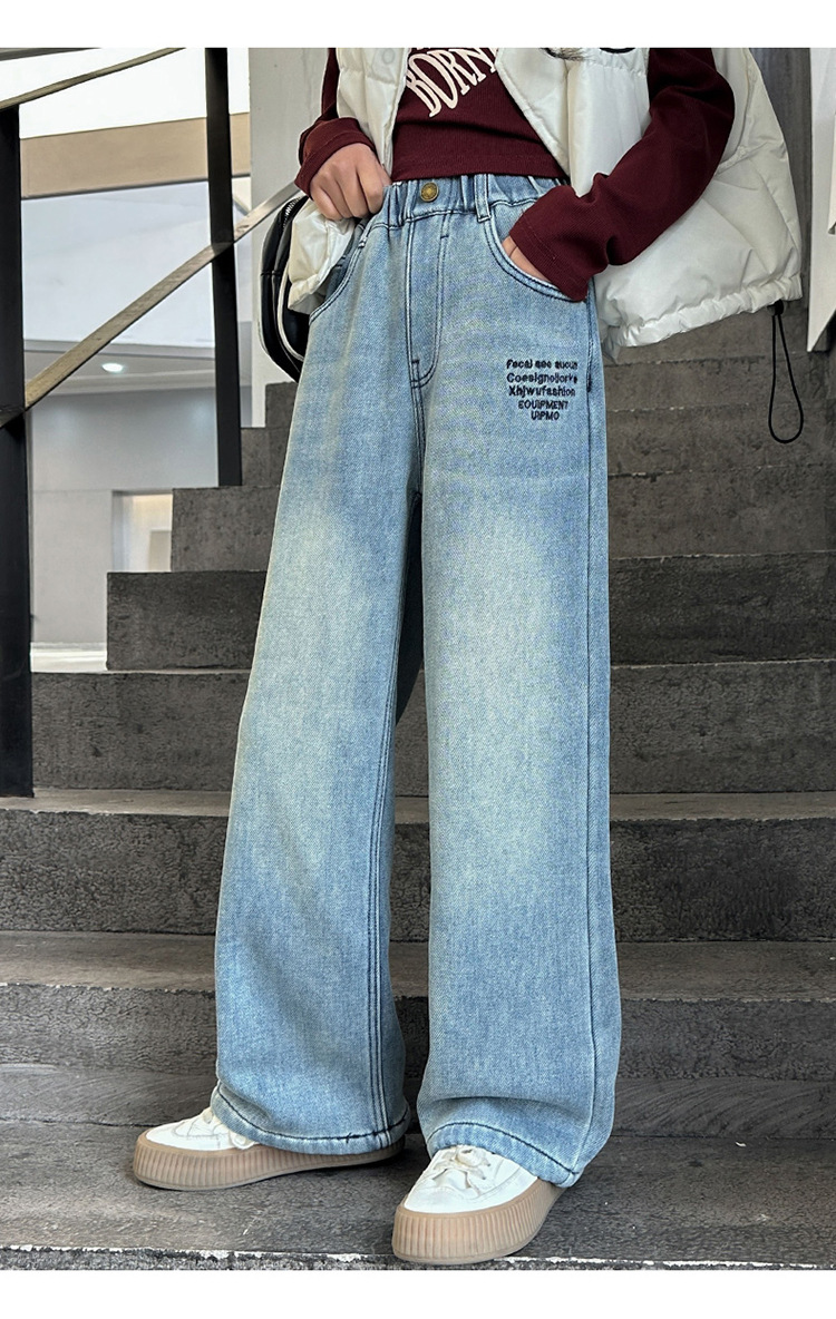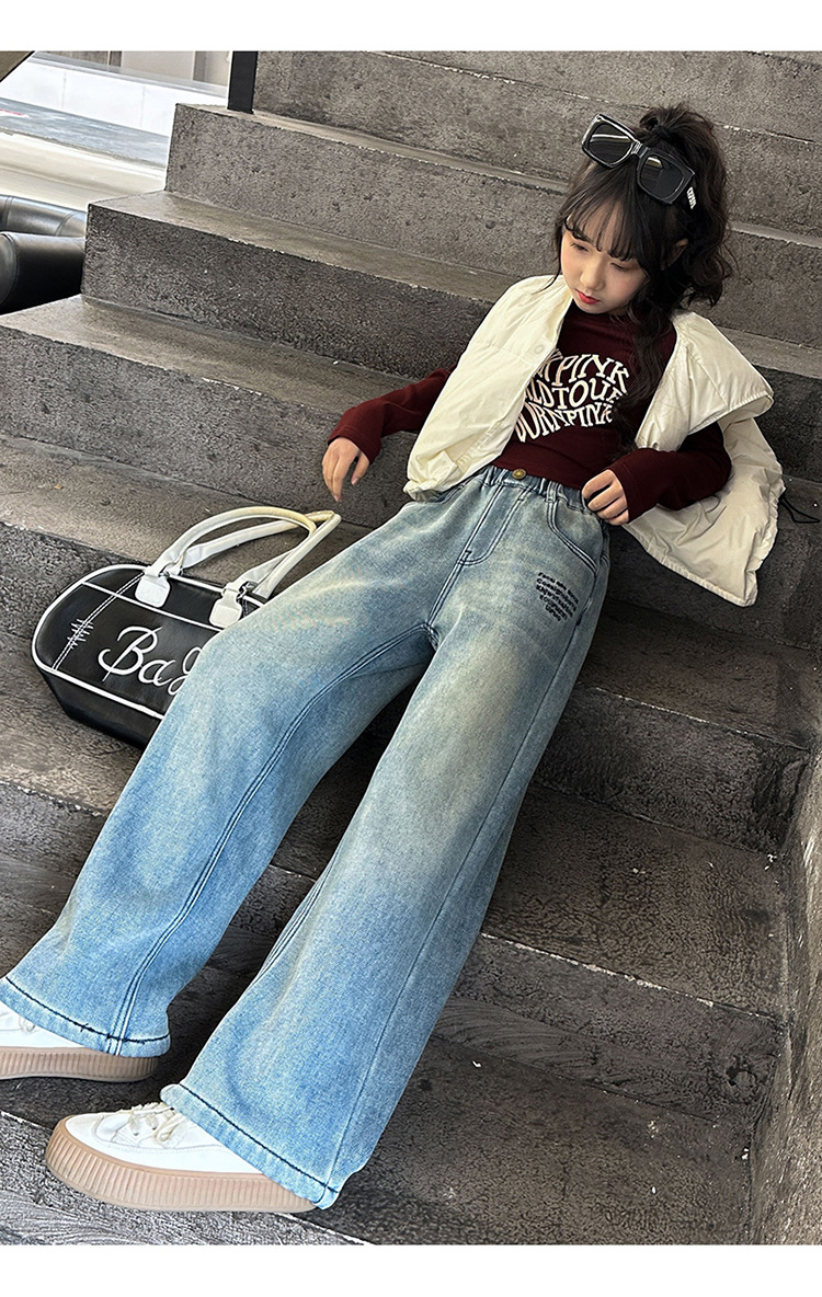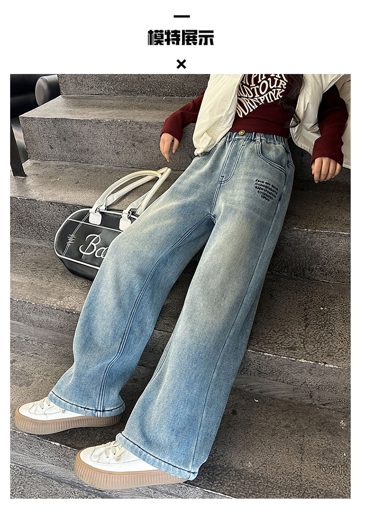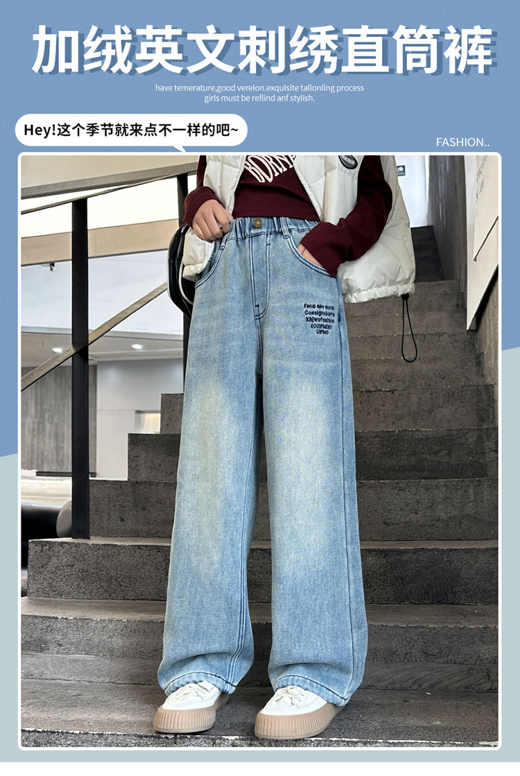 소녀 바지 봄 새로운 스타일 중 큰 어린이 앞과 뒤 영어 자수 청바지 새로운 스타일 어린 소녀의 가을 스트레이트 다리 바지스토어 가기