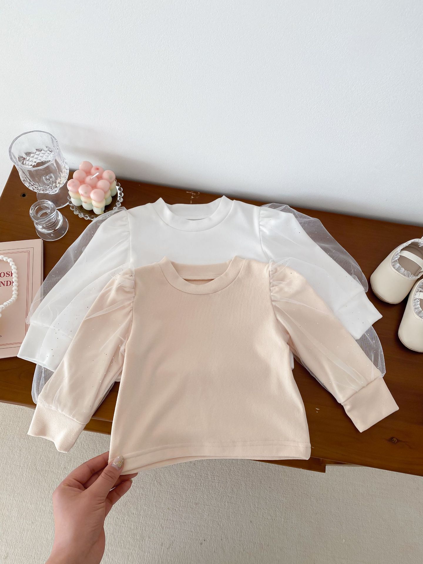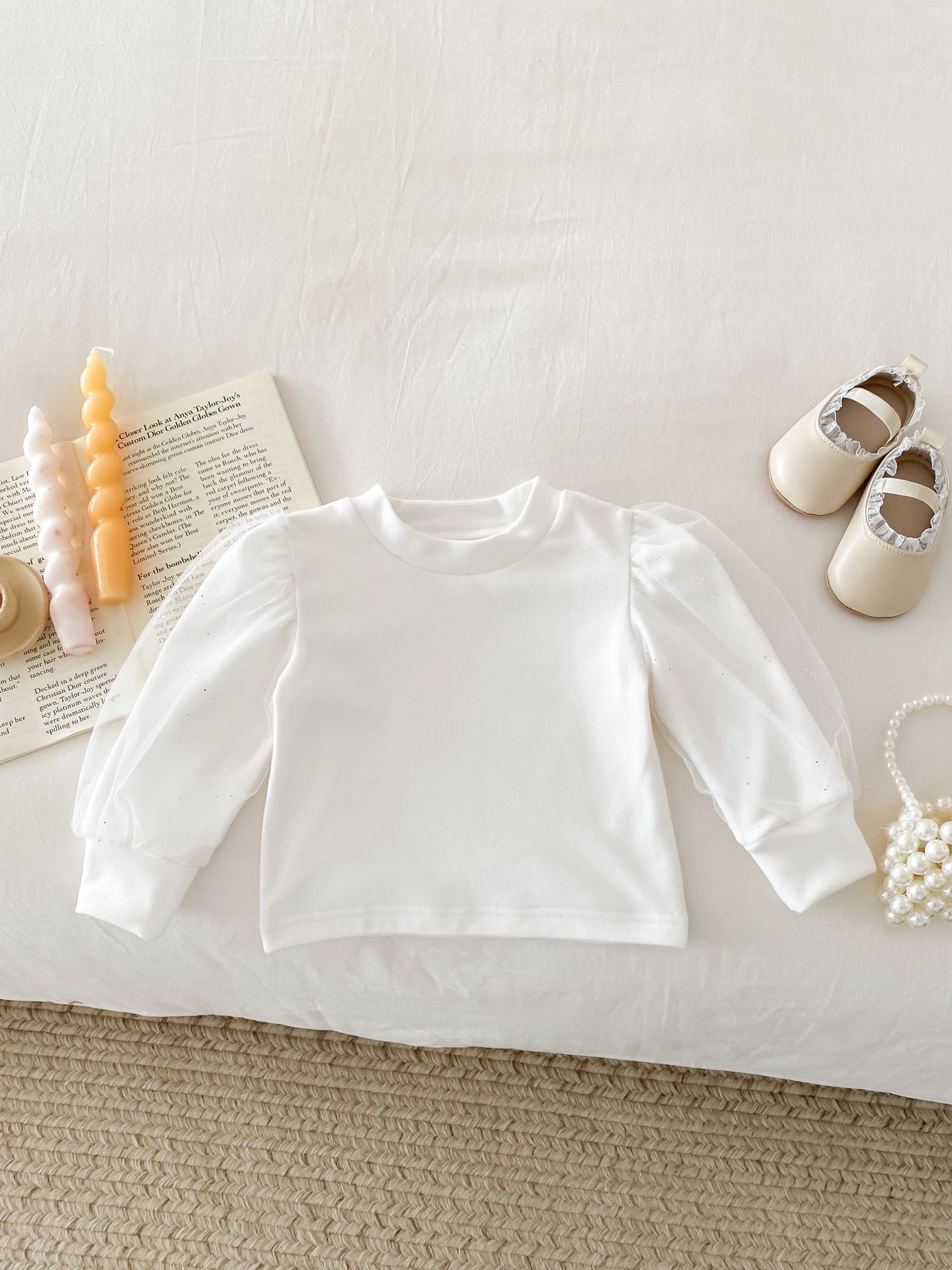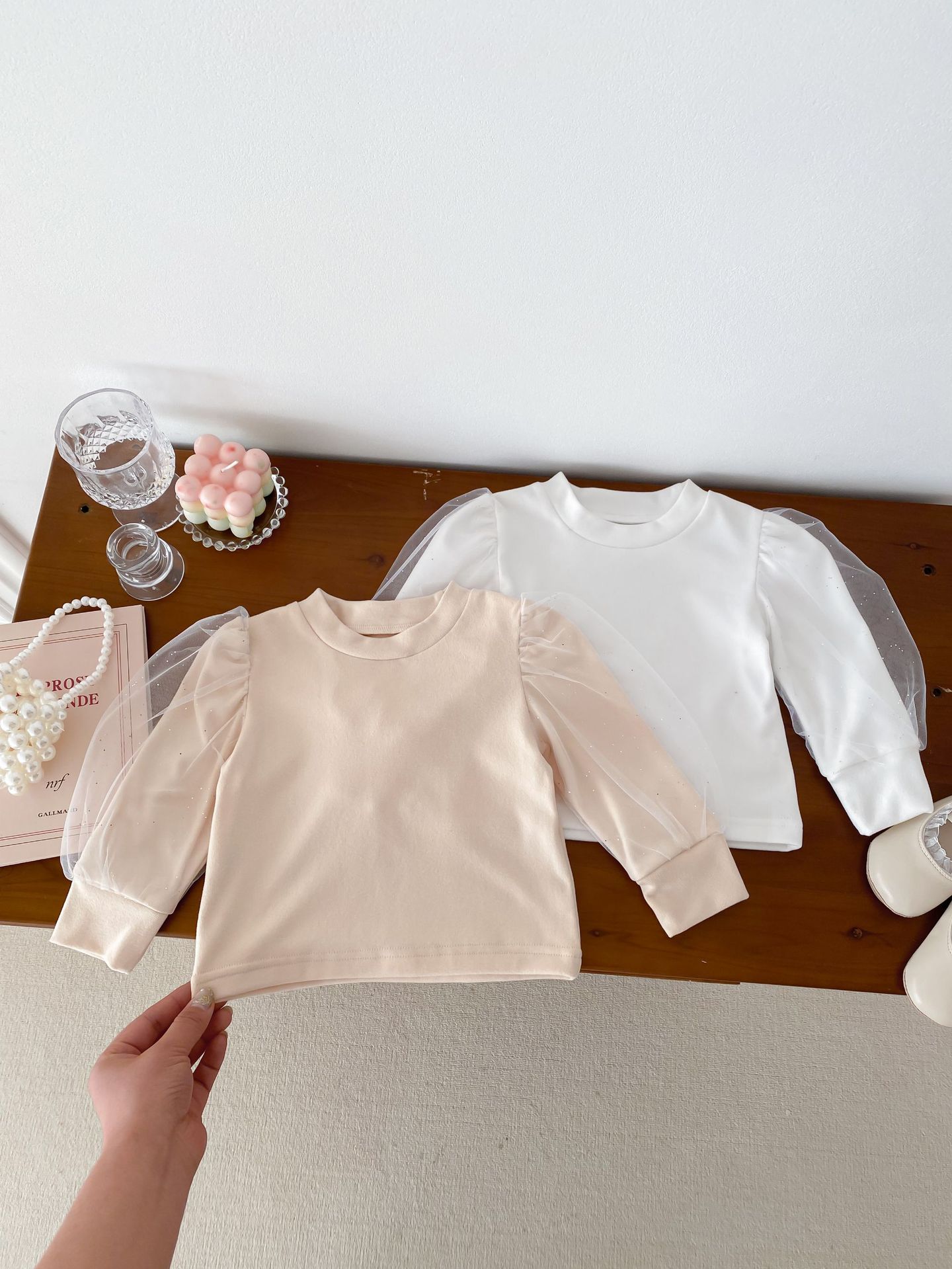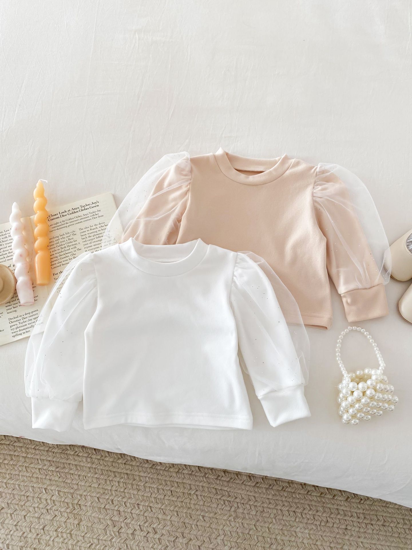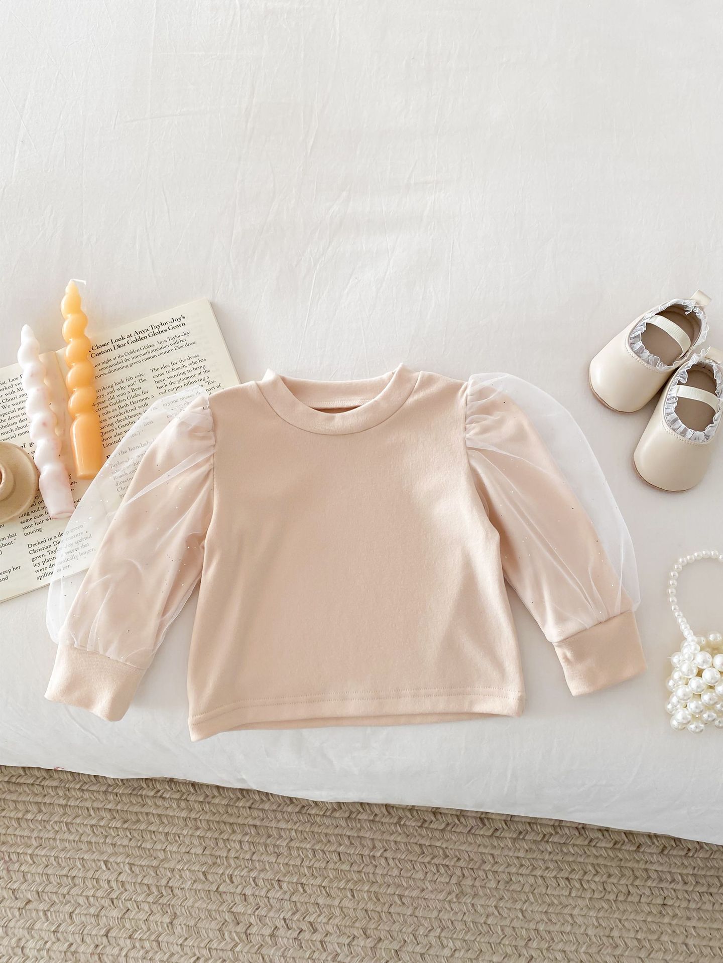 아기 봄 탑 원사 소매 새로운 서양식 소녀 아기 공주 퍼프 소매 바닥 셔츠 면 긴 소매 티셔츠