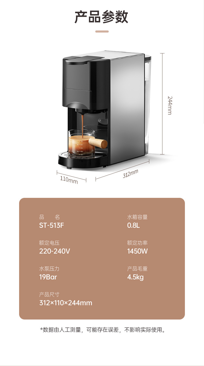 功能:多功能胶囊咖啡机,配三个适配器,冷热双萃取,7档水位