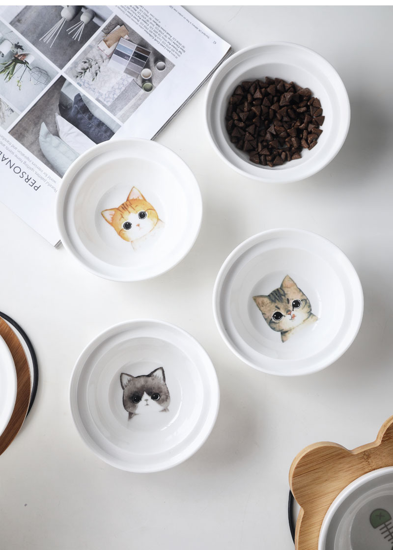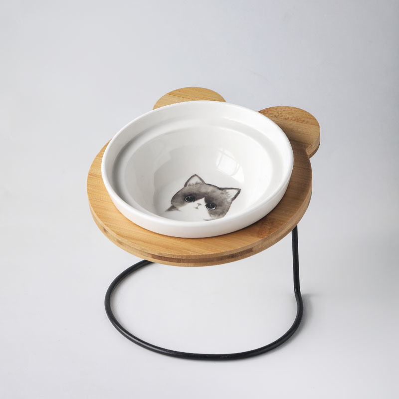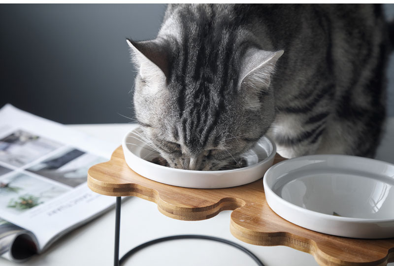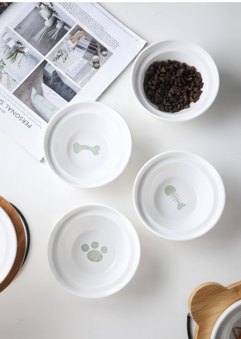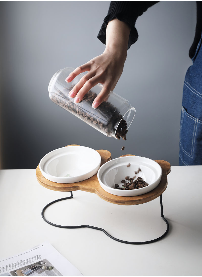 높은 발 비스듬한 입 보호 자궁 경부 척추 통합 더블 나무 랙 개 그릇 세라믹 애완 동물 그릇 더블 그릇 고양이 먹이 그릇스토어 가기