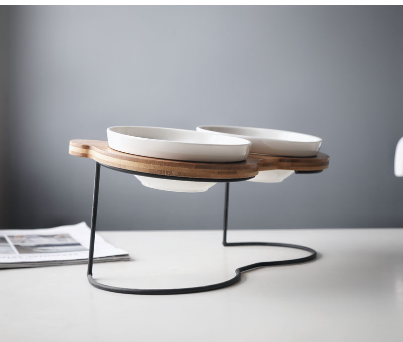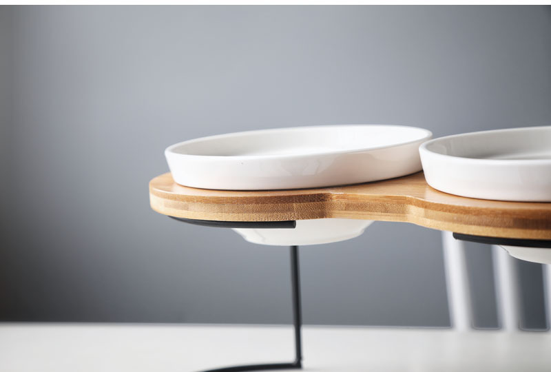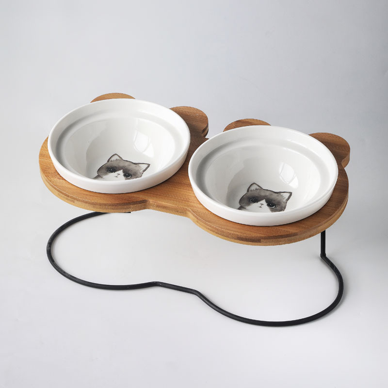높은 발 비스듬한 입 보호 자궁 경부 척추 통합 더블 나무 랙 개 그릇 세라믹 애완 동물 그릇 더블 그릇 고양이 먹이 그릇