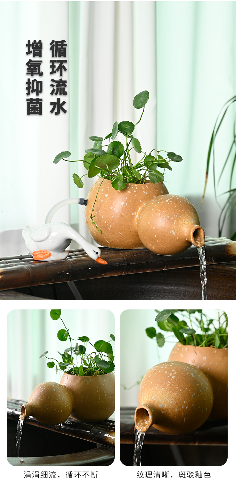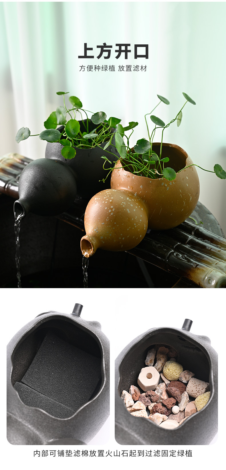 세라믹 조롱박 물 데스크탑 중국 스타일 장식 물고기 탱크 장식 물 출구 수경 녹색 식물 늪 생태 필터