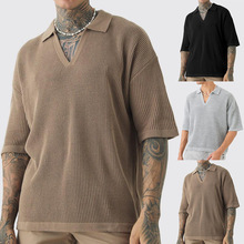 2025欧美跨境春夏新款男士短袖上衣 休闲翻领小V领时尚外贸衬衫男