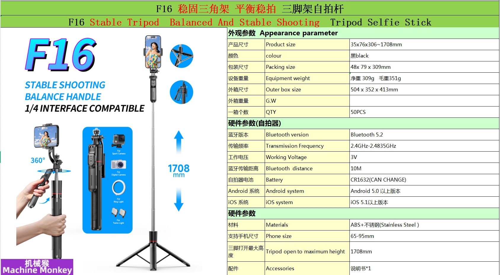 Mechanical Monkey F16 셀카 스틱 블루투스 셀카 장치 플로어 스탠딩 삼각대 휴대용 밸런스 라이브 방송 사진 휴대용 스탠드스토어 가기