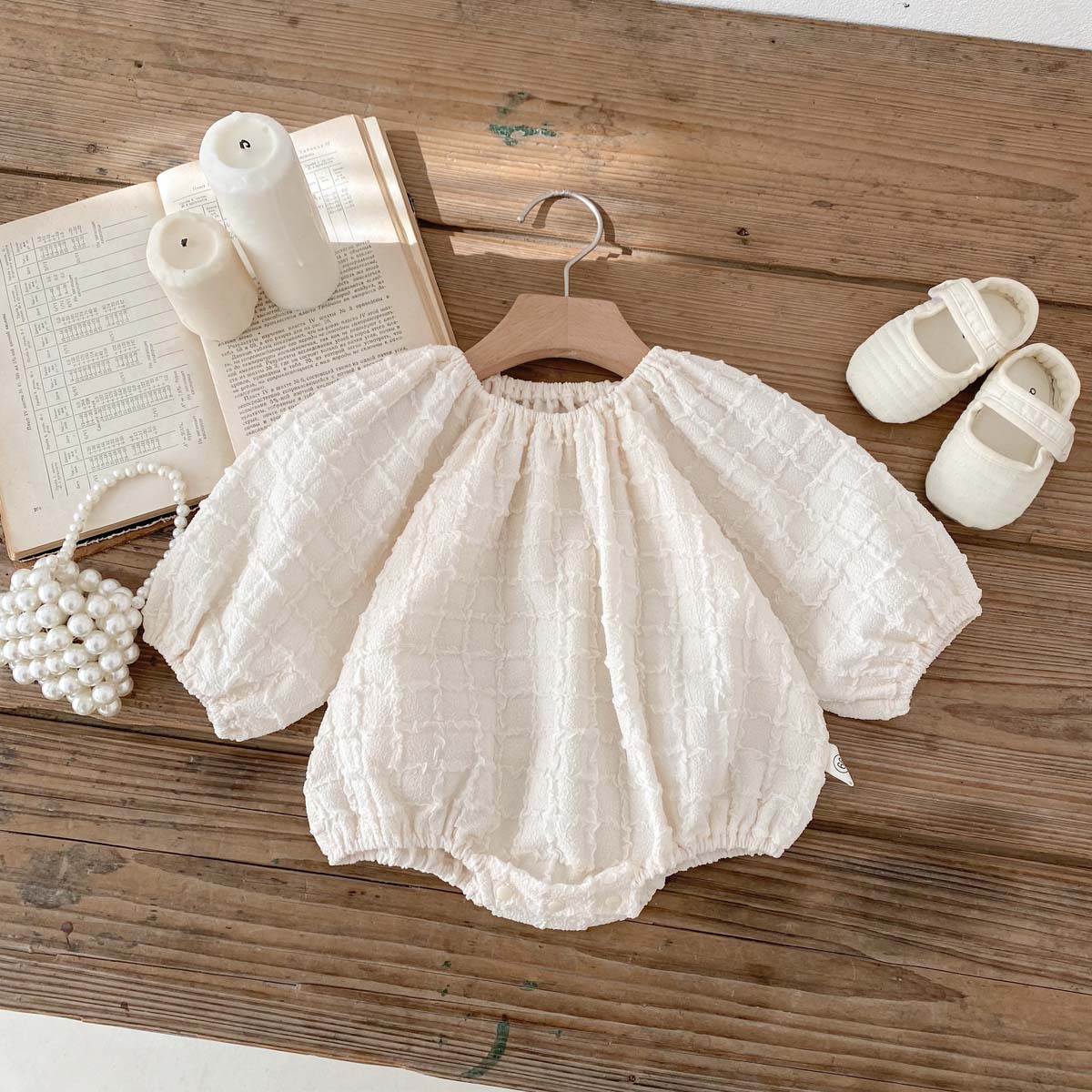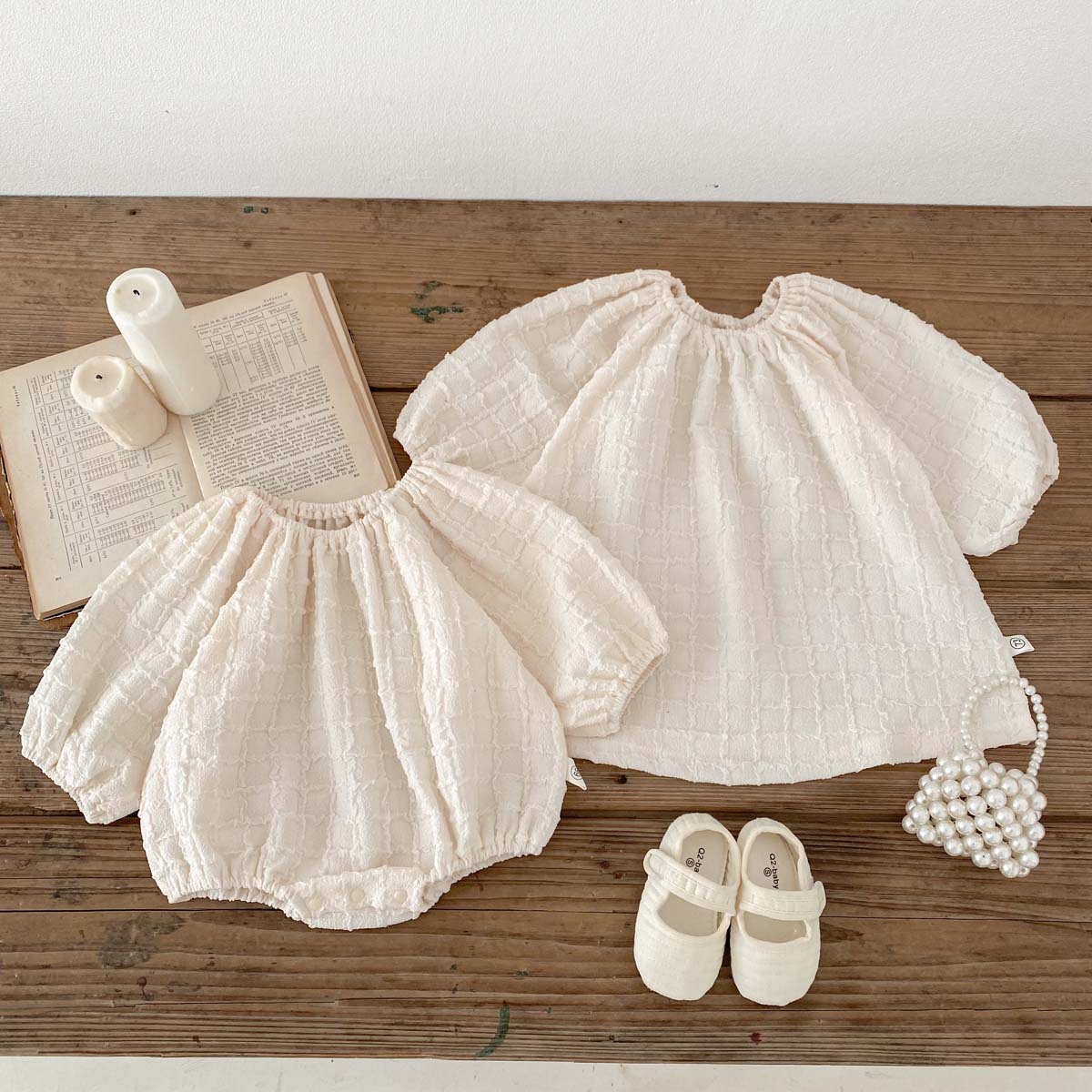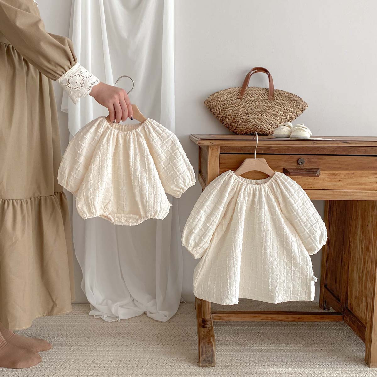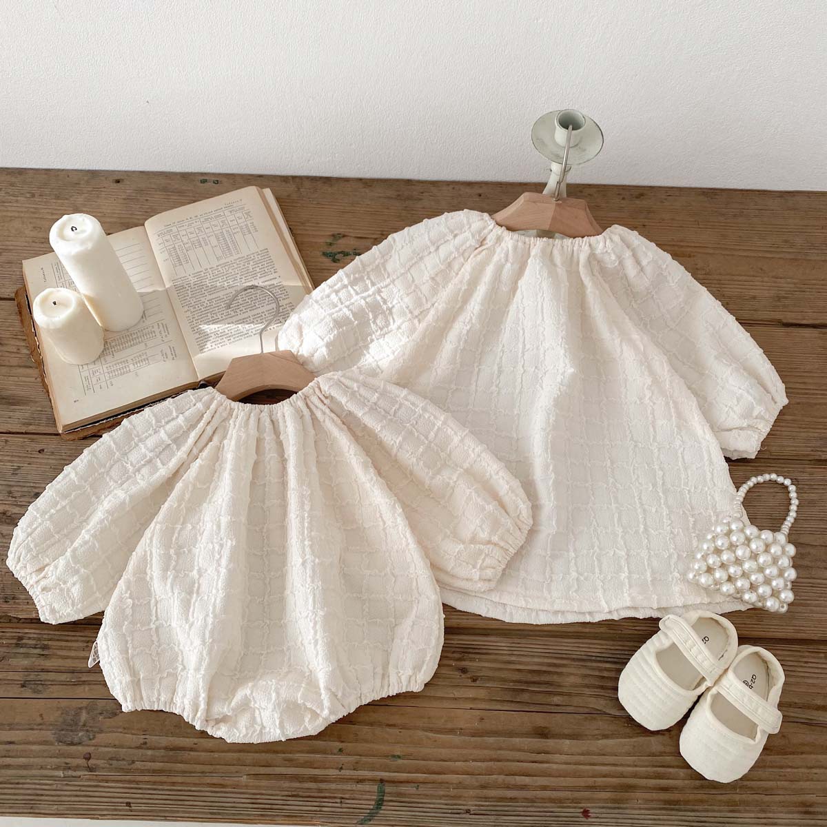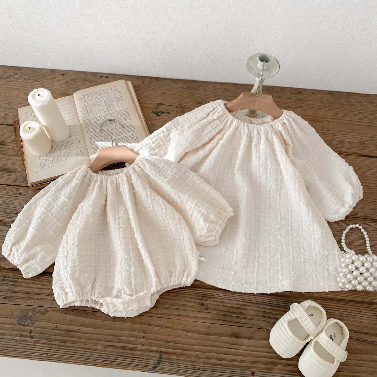 2024 봄 아기 소녀의 나무 귀 단색 점프 수트 아기 롬퍼 퍼프 소매 긴 소매 원피스 자매 착용