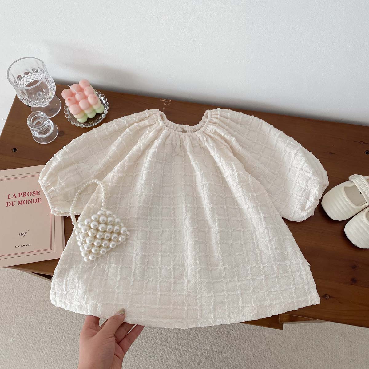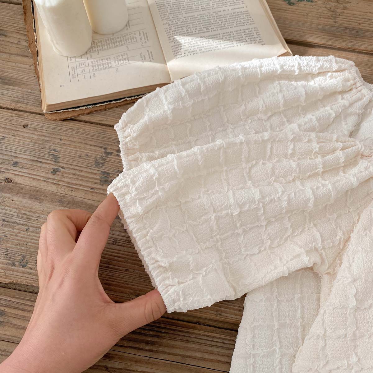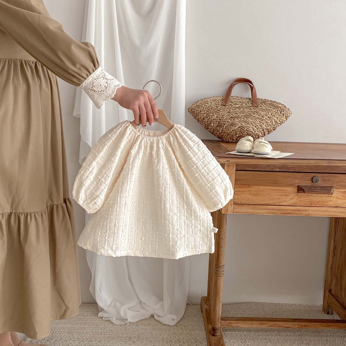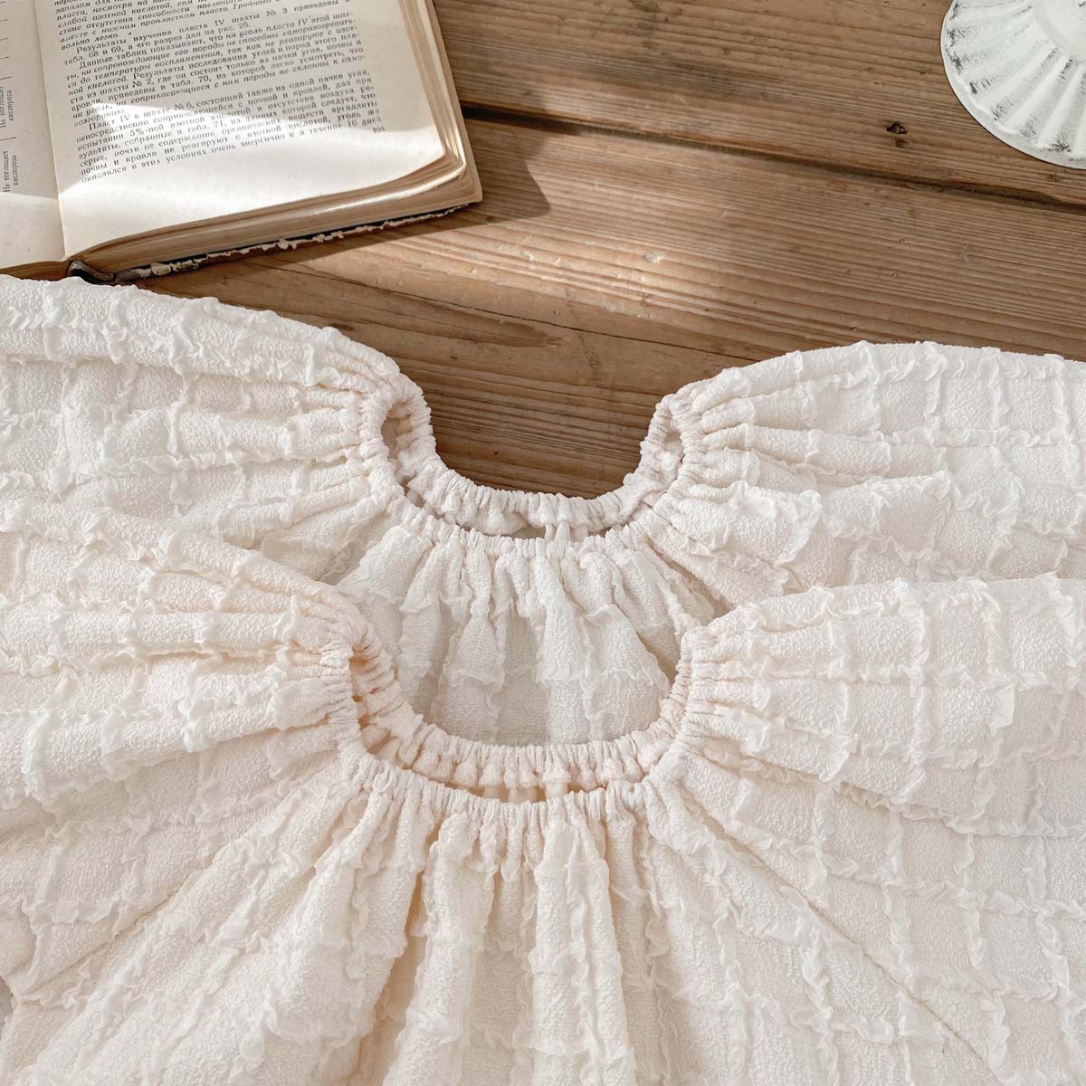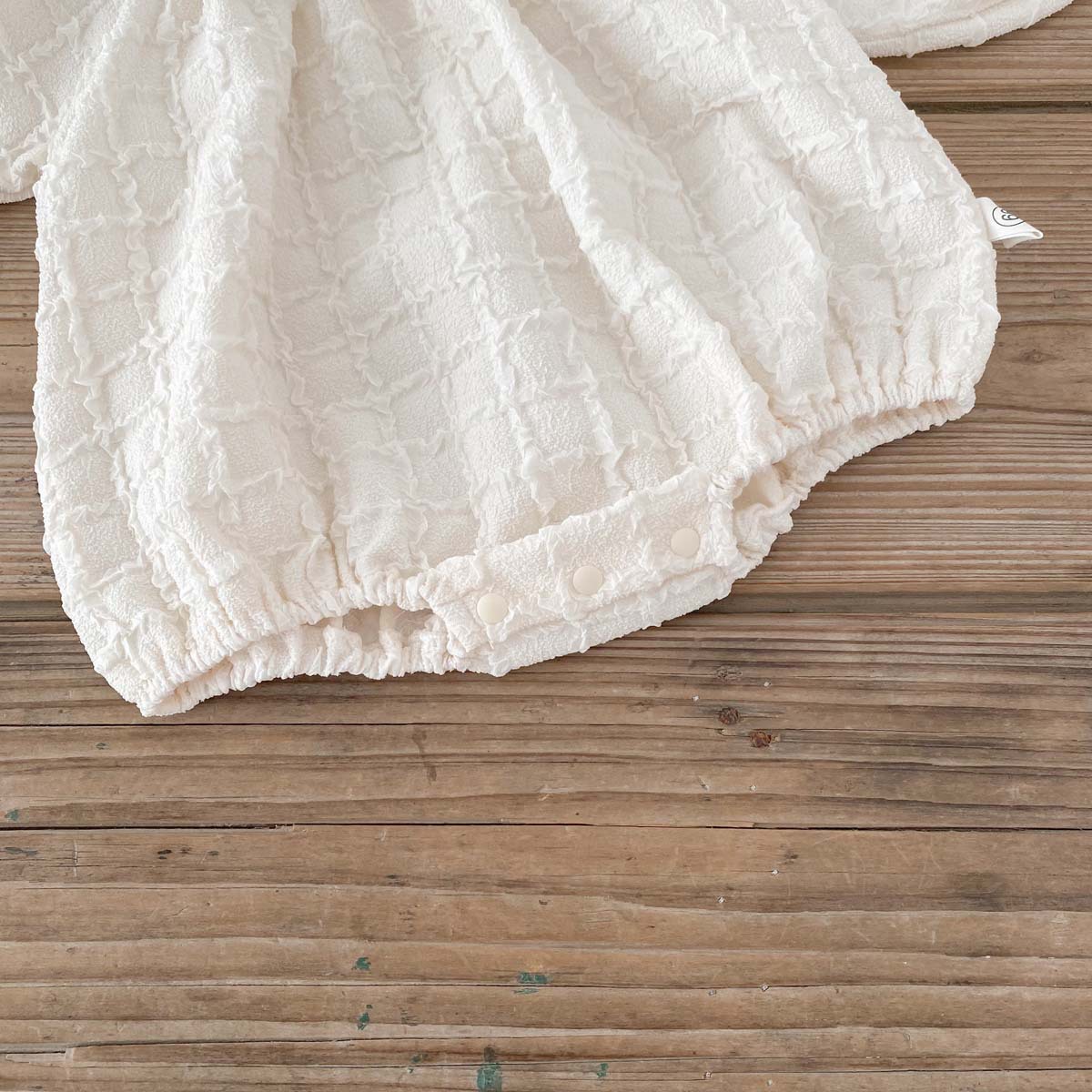 2024 봄 아기 소녀의 나무 귀 단색 점프 수트 아기 롬퍼 퍼프 소매 긴 소매 원피스 자매 착용
