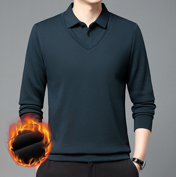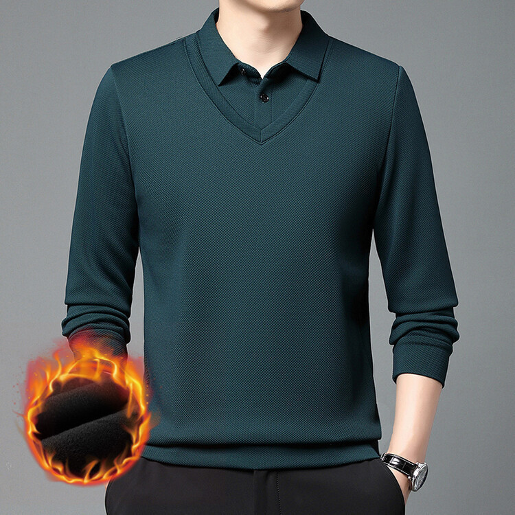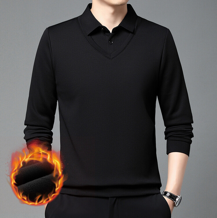 2023秋冬新款男士T恤衫绒休闲翻领假两件上衣男长袖衫一件代发