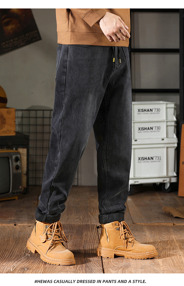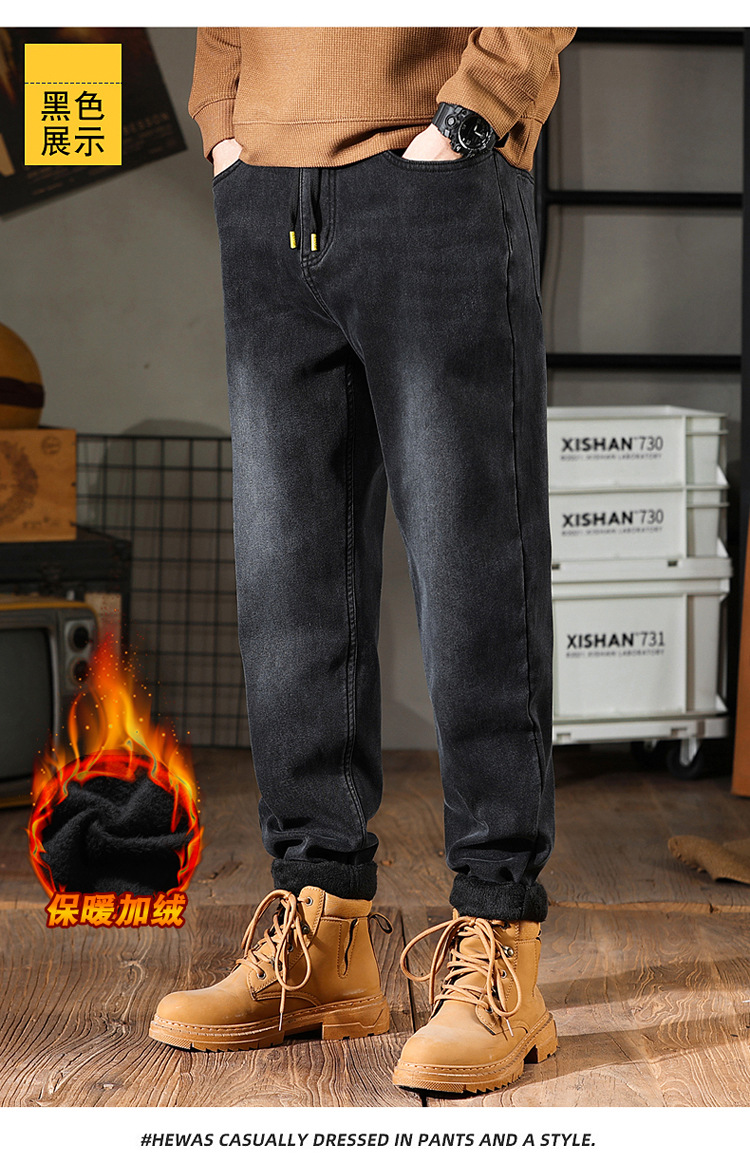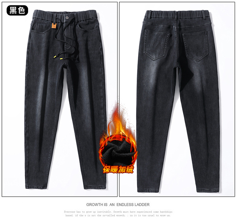 2023 겨울 높은 스트레치 기모 청바지 남성용 슬림 핏 스키니 플러스 사이즈 뚱뚱한 스트레치 팬츠 패션