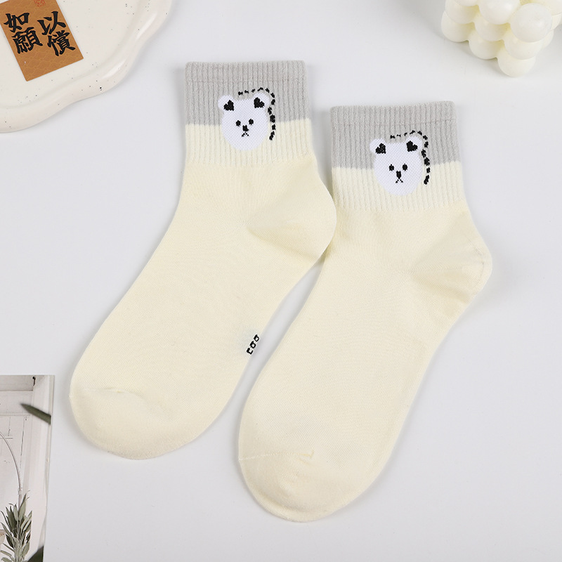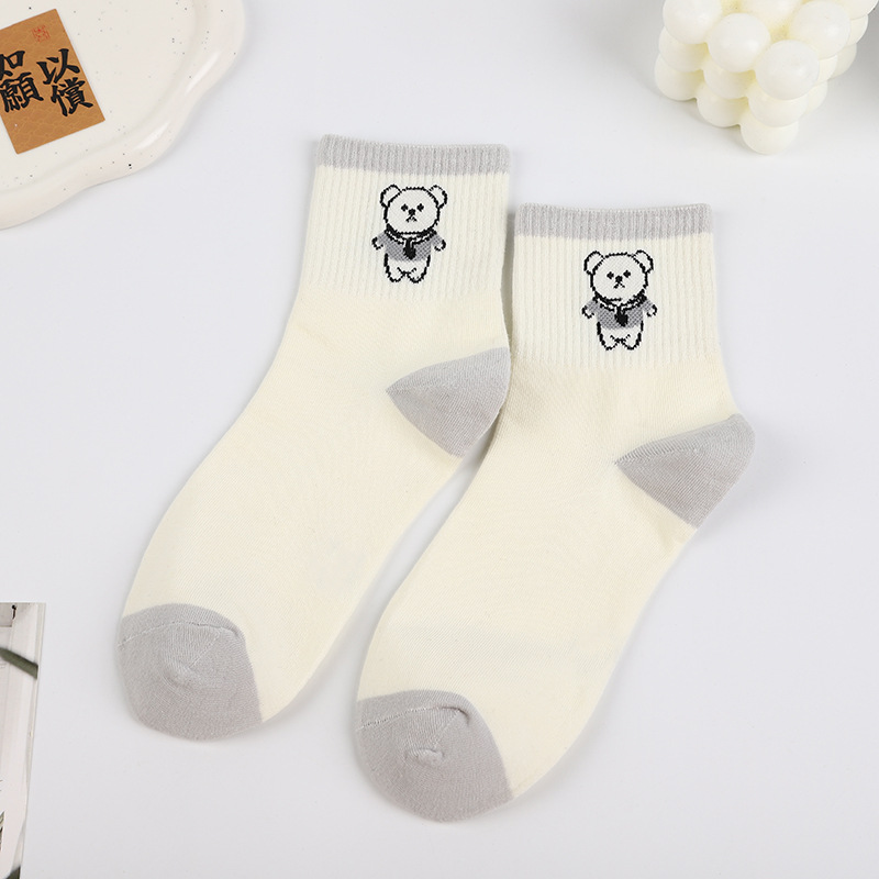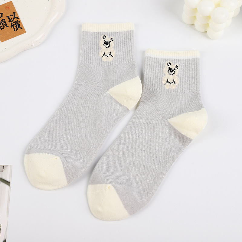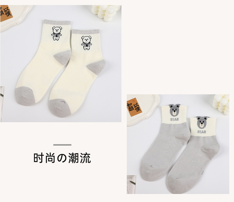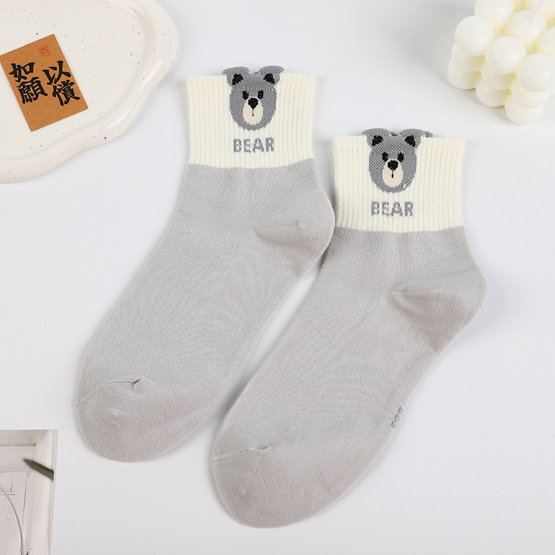 Tiktok 뜨거운 판매 베이지 색 흰색 회색 스티칭 곰 양말 여성 만화 귀여운 중간 종아리 길이 양말 한국 대학 스타일 짧은 양말