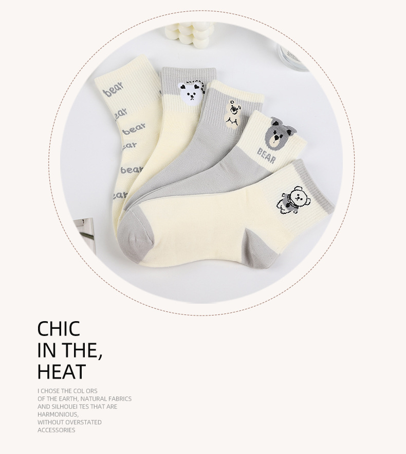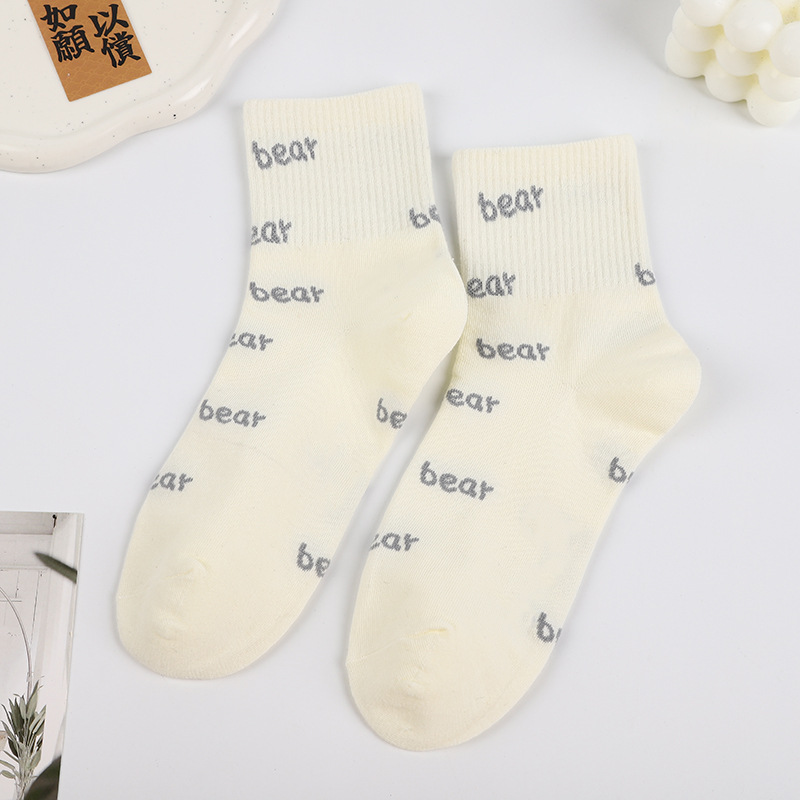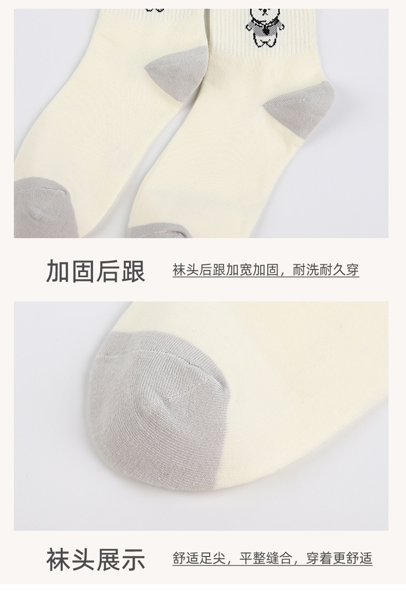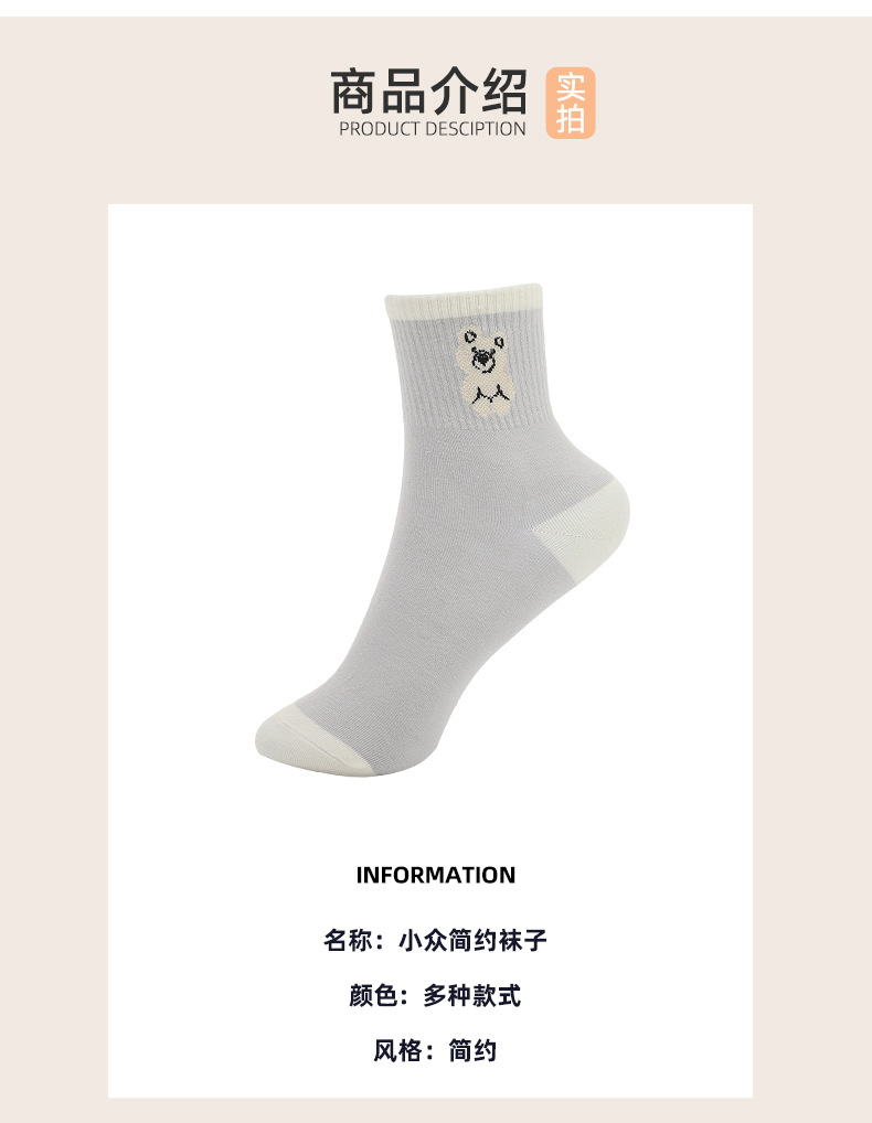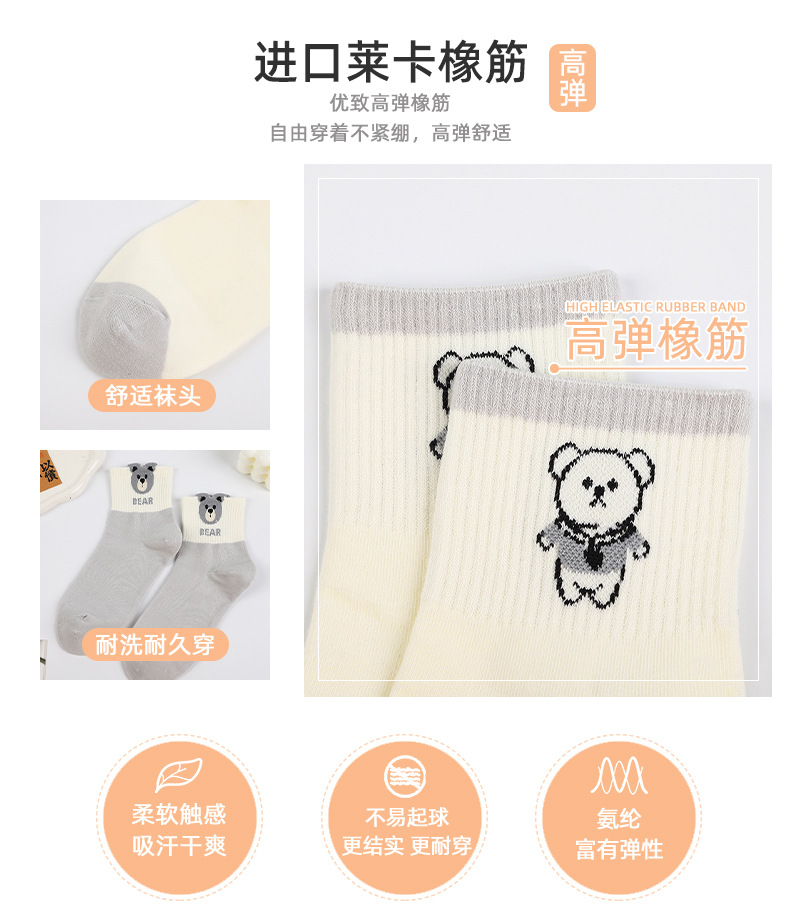 Tiktok 뜨거운 판매 베이지 색 흰색 회색 스티칭 곰 양말 여성 만화 귀여운 중간 종아리 길이 양말 한국 대학 스타일 짧은 양말