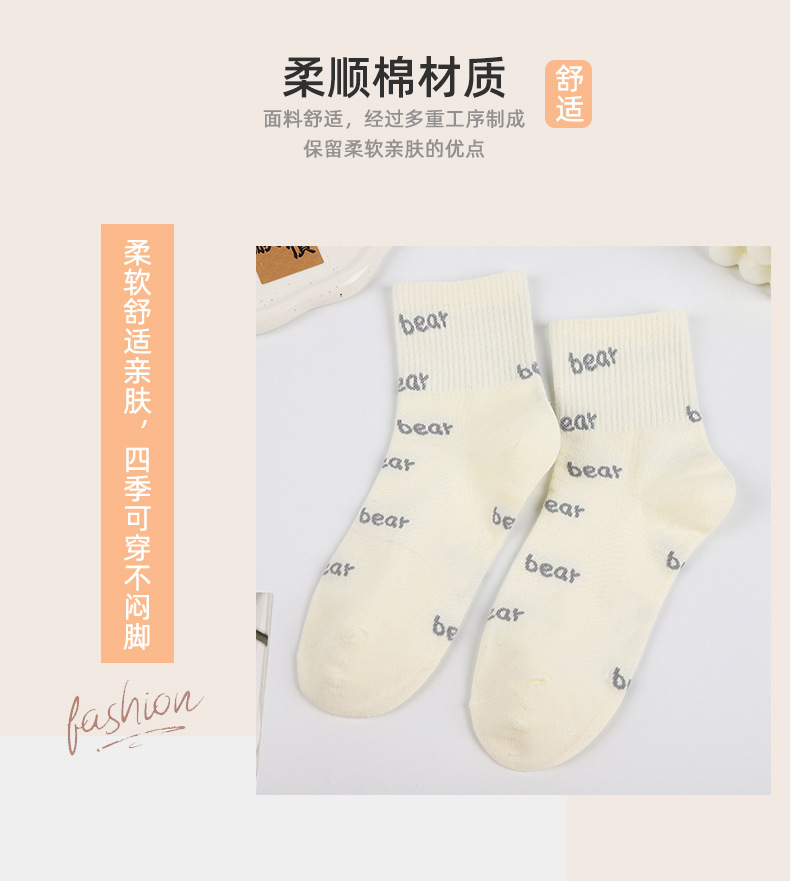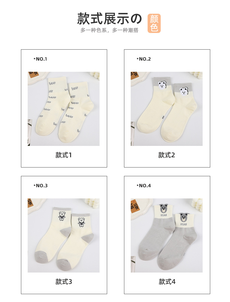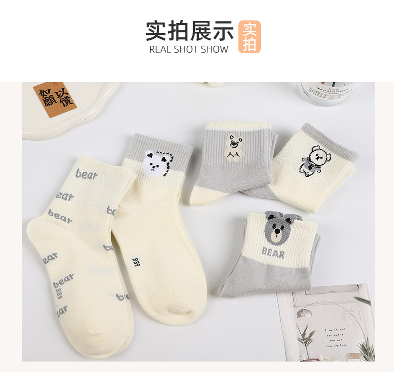 Tiktok 뜨거운 판매 베이지 색 흰색 회색 스티칭 곰 양말 여성 만화 귀여운 중간 종아리 길이 양말 한국 대학 스타일 짧은 양말스토어 가기