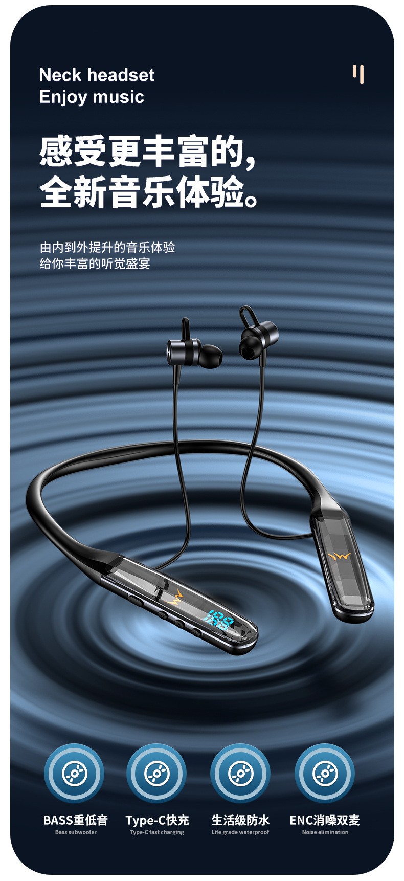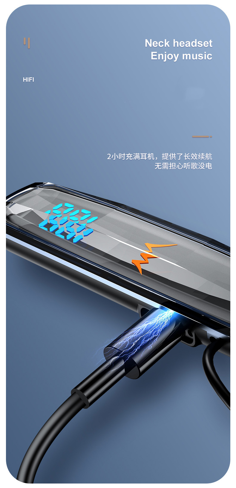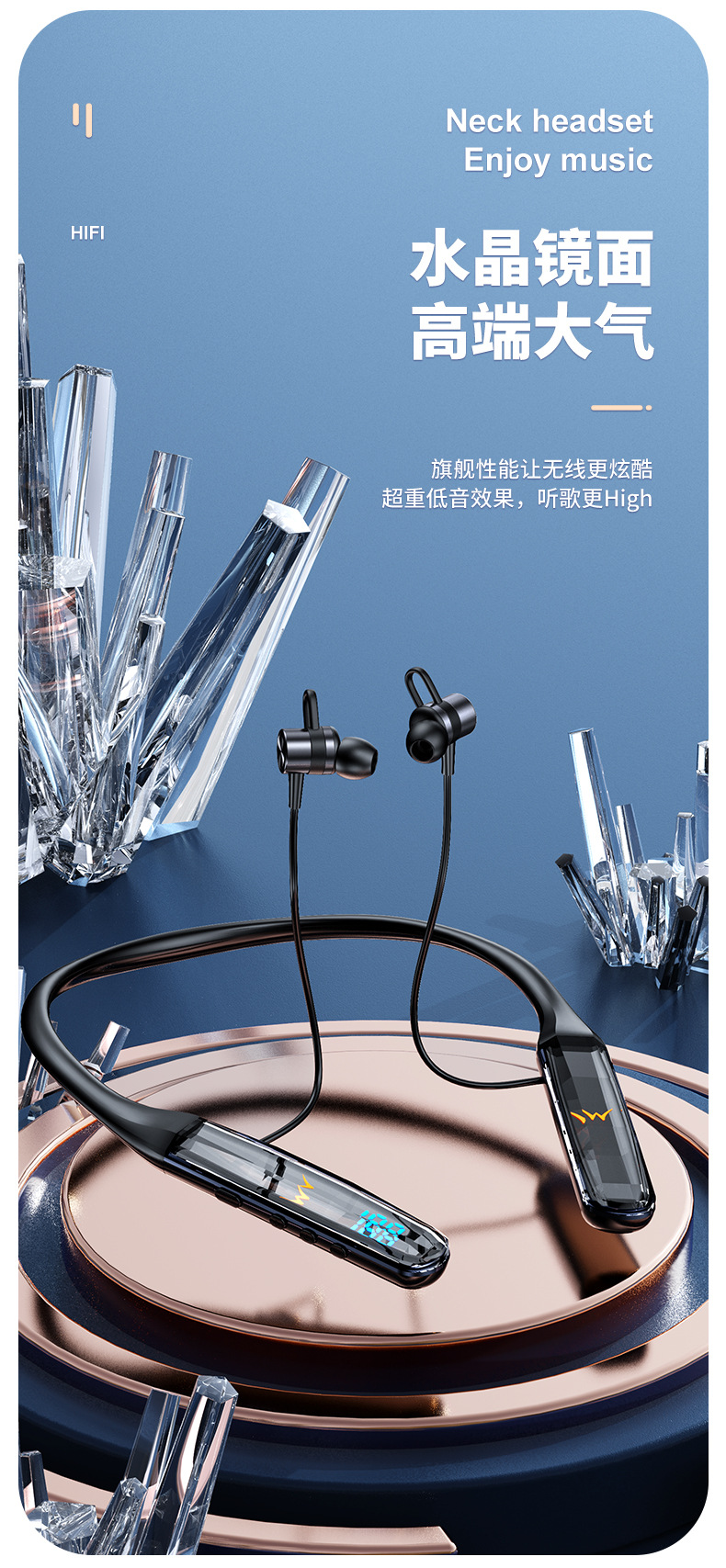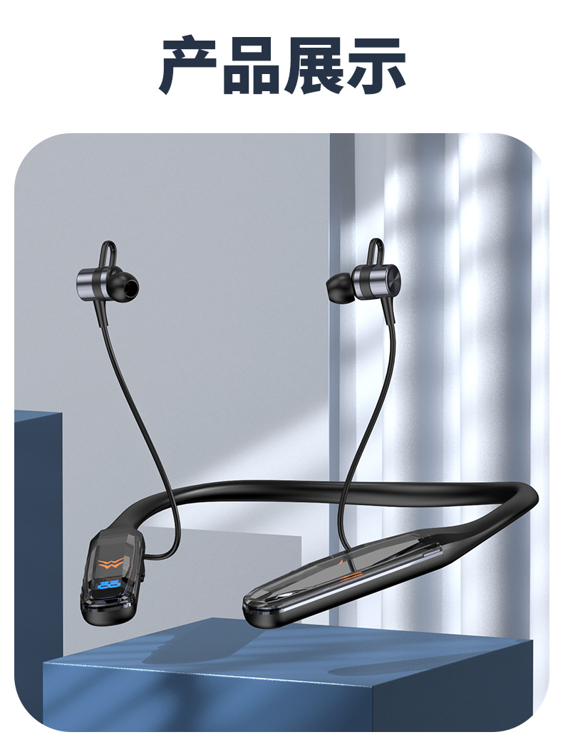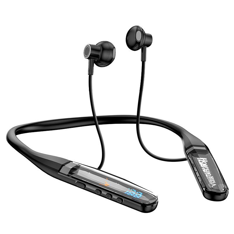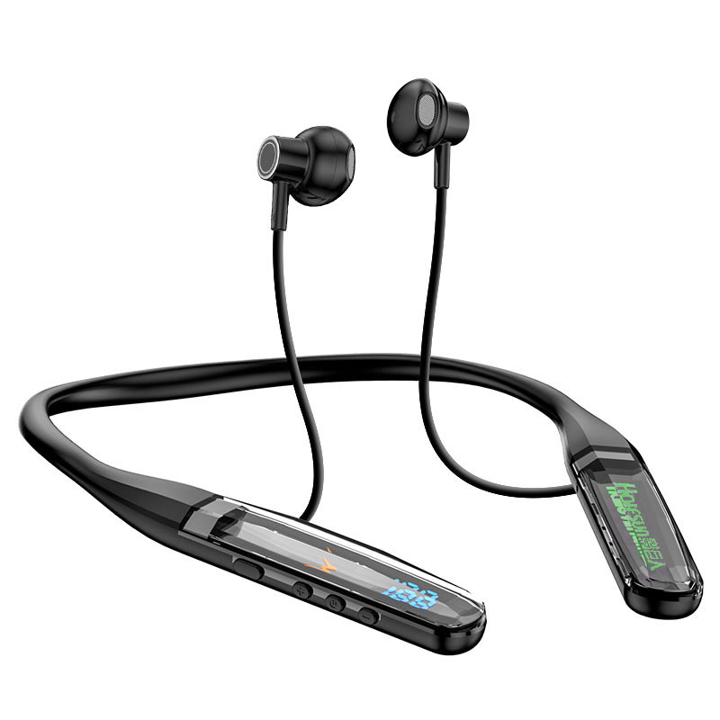 목에 장착 된 무선 블루투스 헤드셋 크리스탈 디지털 디스플레이 울트라 긴 대기 고삐 헤드셋 유니섹스 스포츠 헤드셋