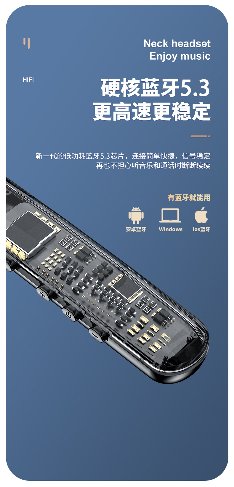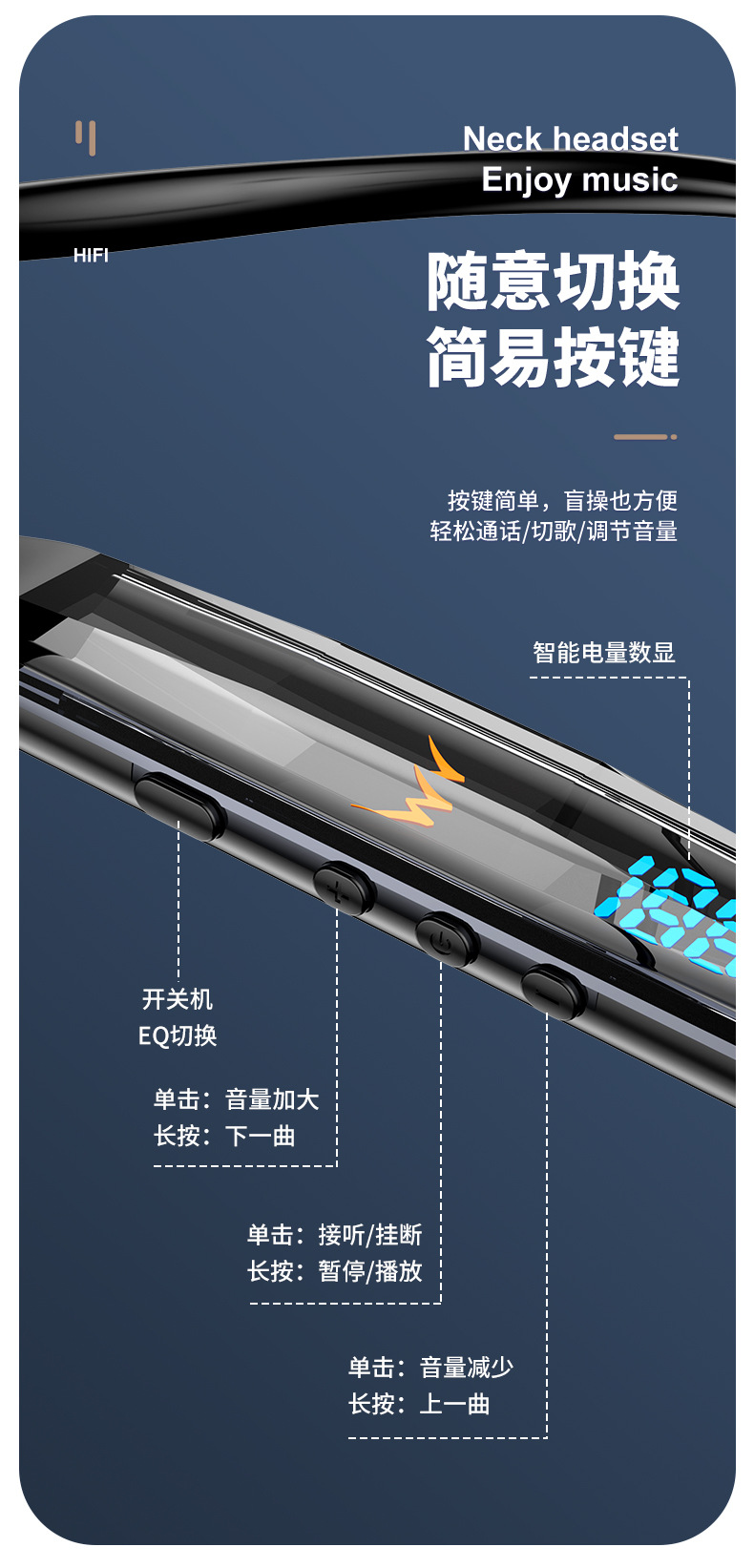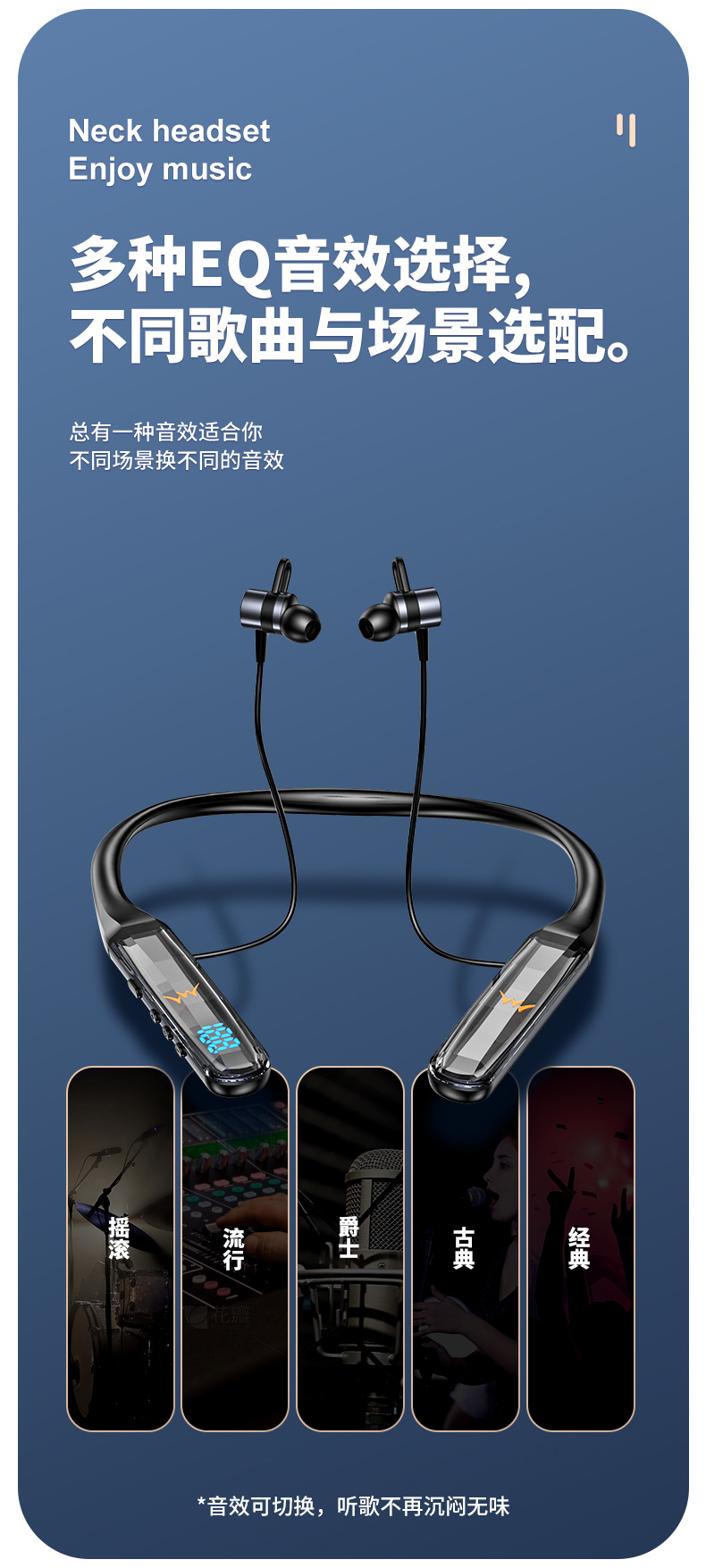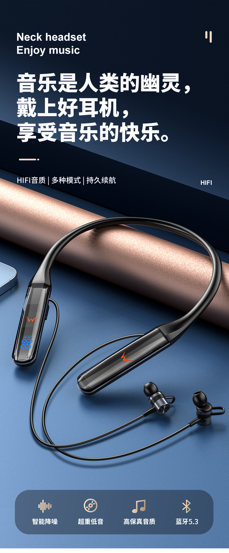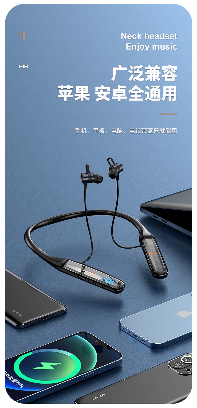 목에 장착 된 무선 블루투스 헤드셋 크리스탈 디지털 디스플레이 울트라 긴 대기 고삐 헤드셋 유니섹스 스포츠 헤드셋