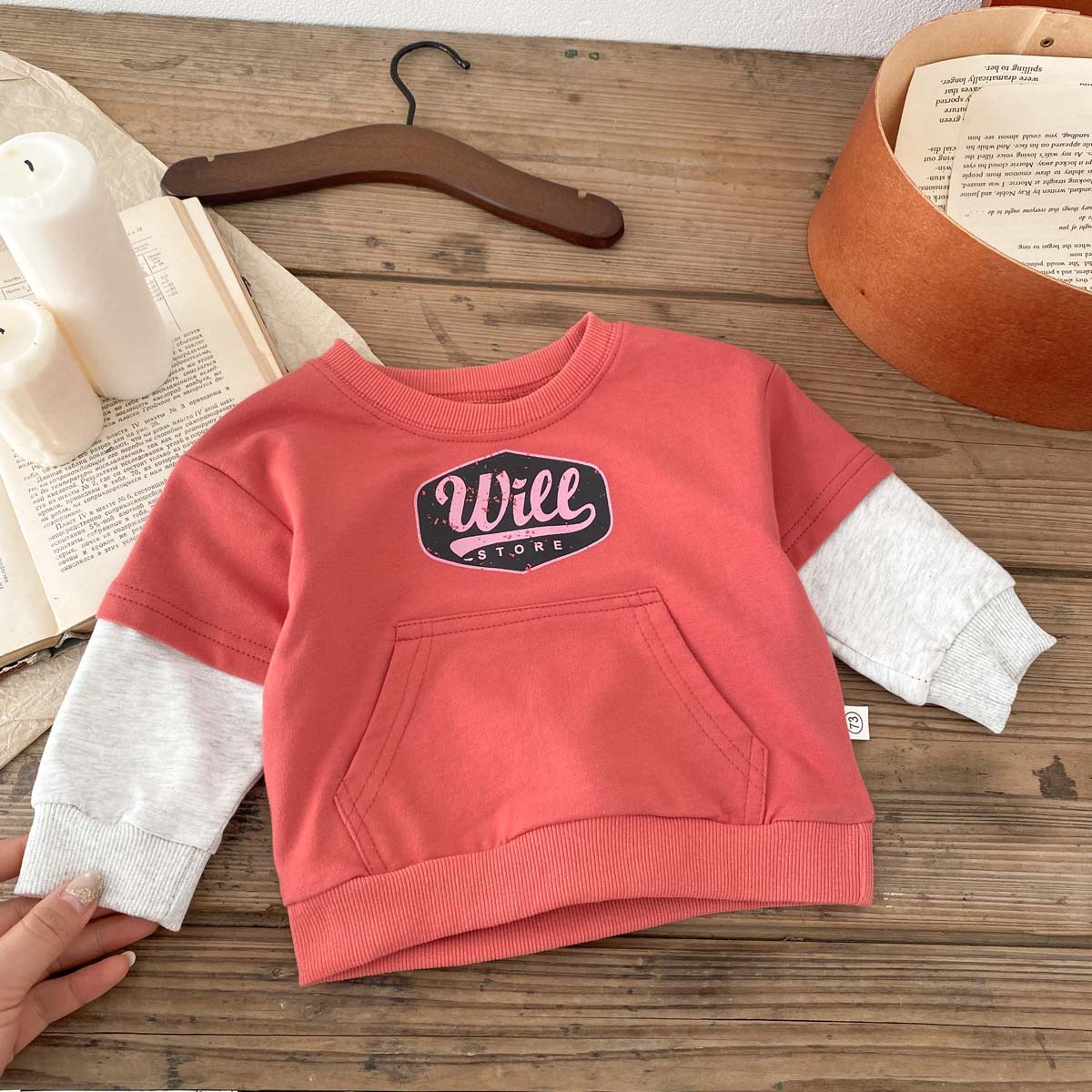봄 한국식 남성과 여성 아기 스티칭 대비 컬러 스웨터 아기 서양식 문자 프린트 긴 소매 가짜 투피스 탑스토어 가기