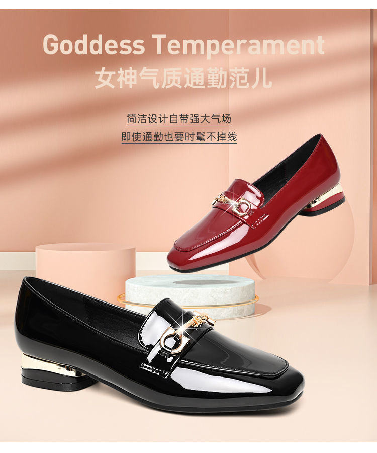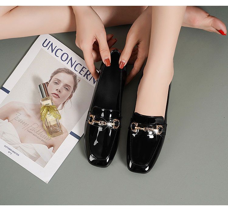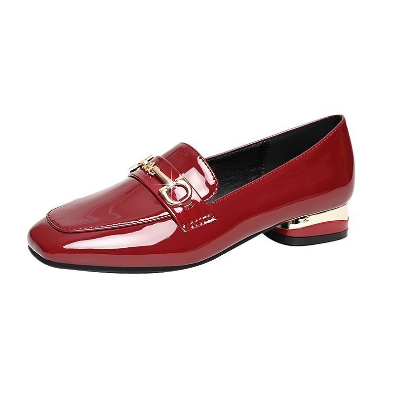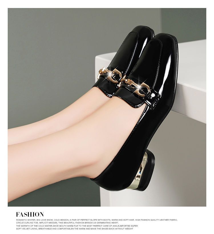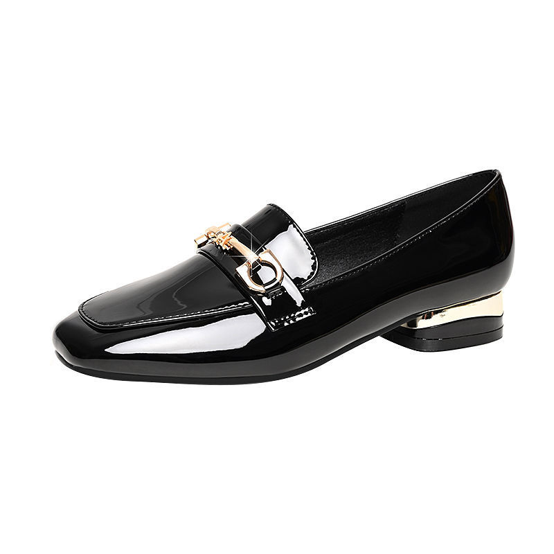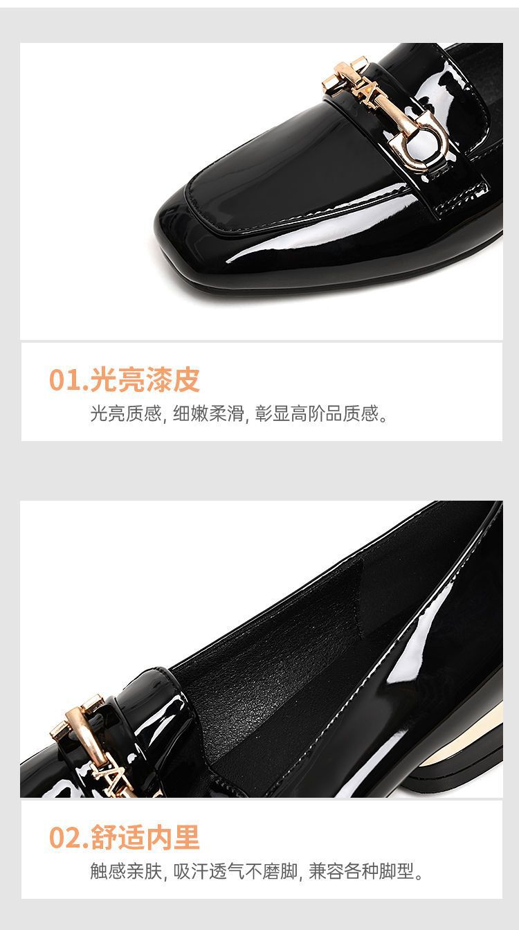 새로운 특허 가죽 싱글 레이어 신발 사각 발가락 청키 힐 로우 힐 편안한 올 매치 미끄럼 방지 영국 스타일 가죽 신발 올 매치 말 버클 여성 신발