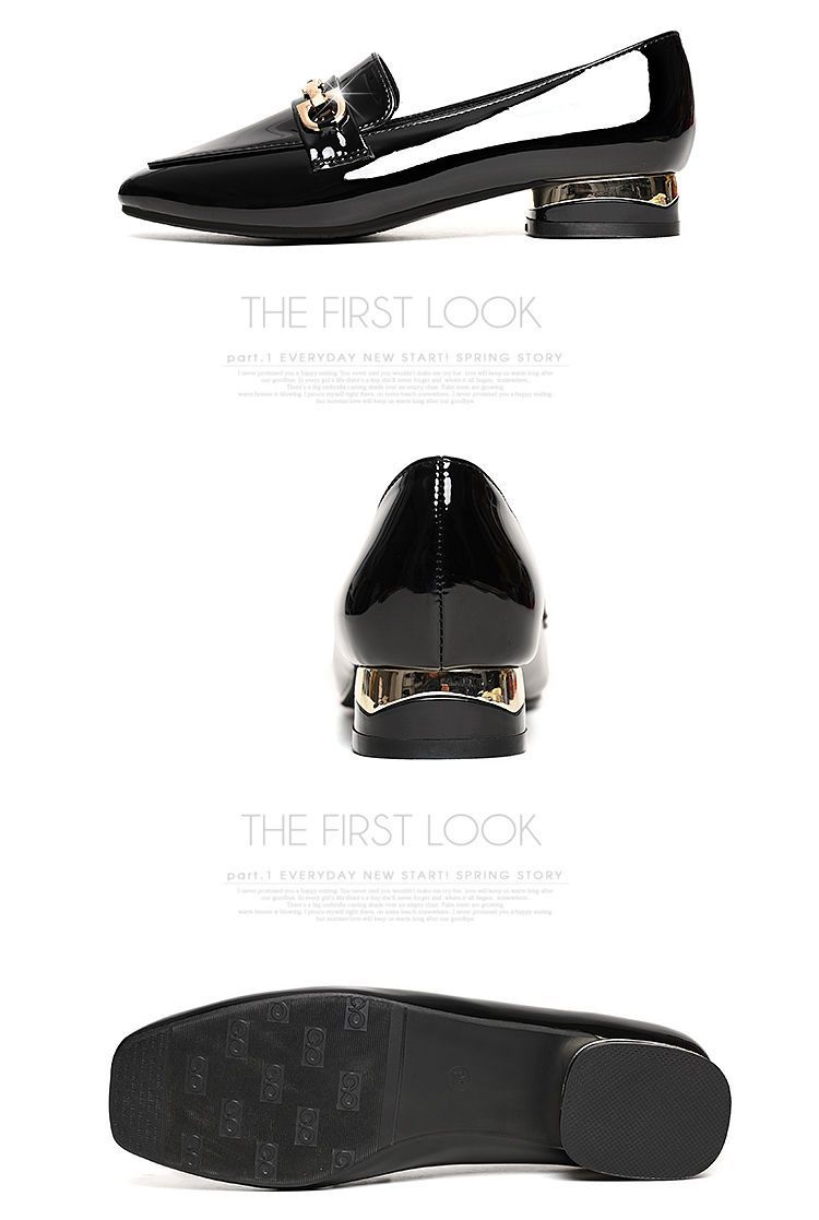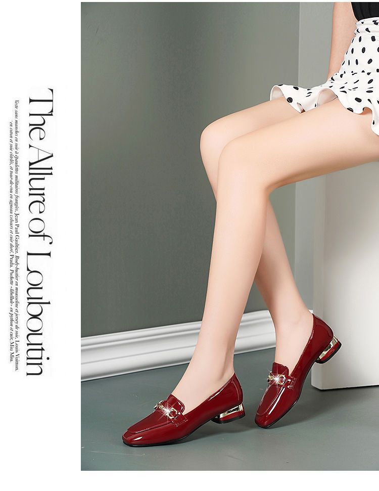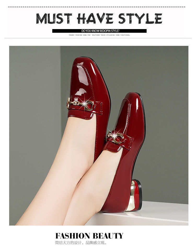 새로운 특허 가죽 싱글 레이어 신발 사각 발가락 청키 힐 로우 힐 편안한 올 매치 미끄럼 방지 영국 스타일 가죽 신발 올 매치 말 버클 여성 신발스토어 가기