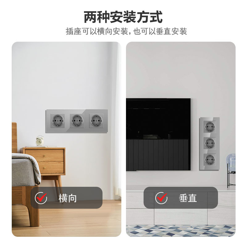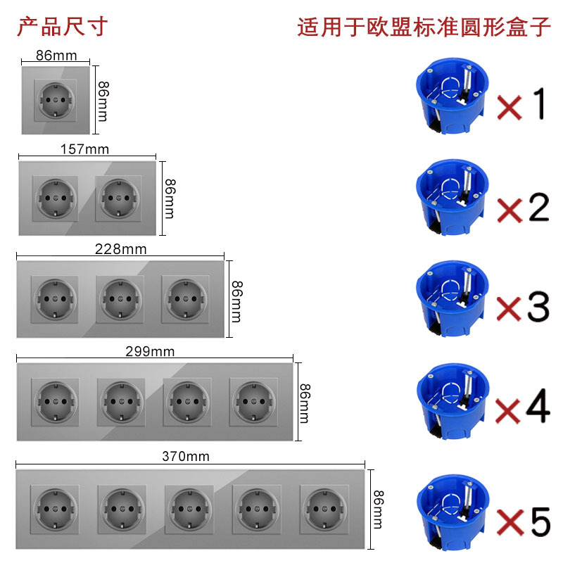 我们的开关插座适用欧盟标准圆形盒子、欧盟标准方形盒子它可以模向组合安装,也可以垂直组合安装undefined