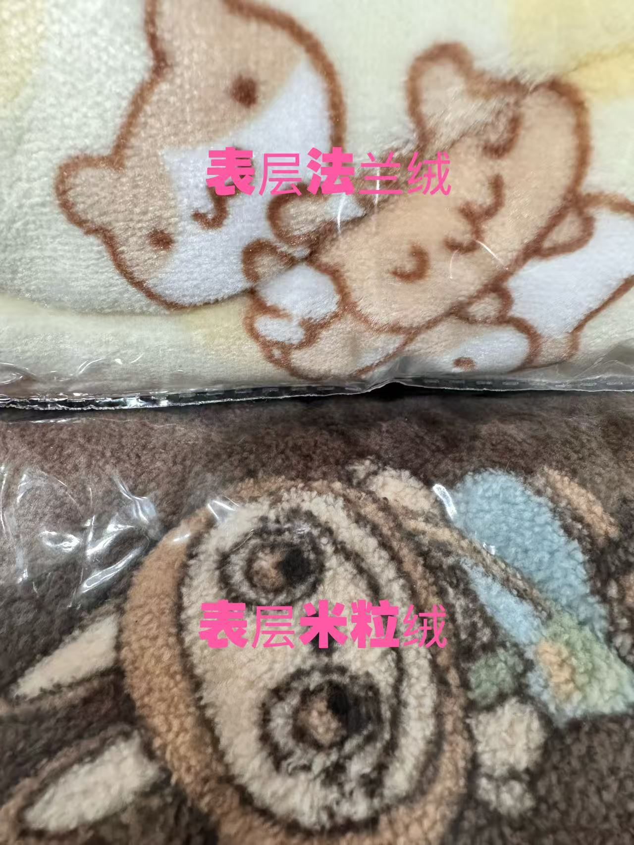 外观不同:法兰绒表面有一层丰满细洁的绒毛覆盖,不露织纹,绒面细腻、密度紧实。米粒绒表面有细小的颗粒状绒毛,呈现出如米粒般细腻的质感,纹理清晰。但是共同点都是锁温保暖性强
