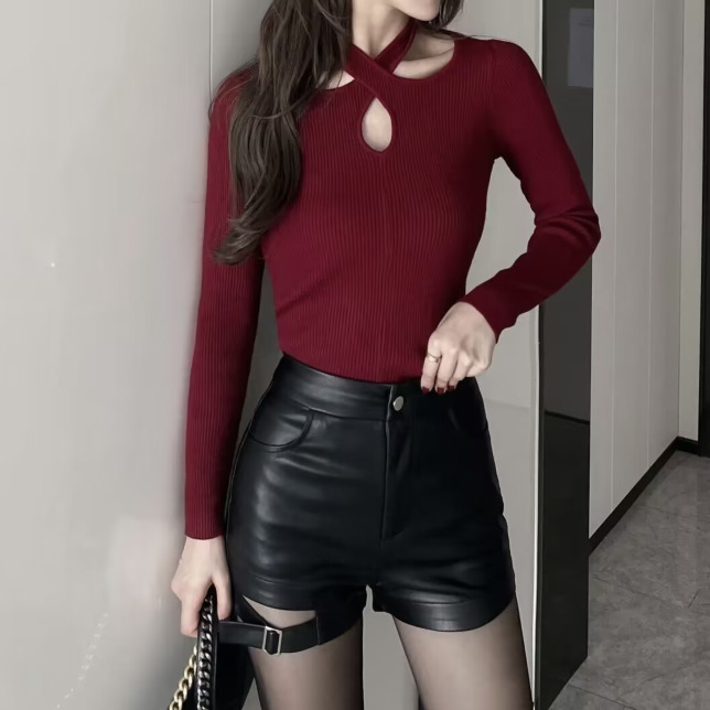 디자인 센스 틈새 빈 버클 PU 가죽 반바지 여성의 가을과 겨울 우아한 슬림 핏 슬리밍 블랙 바지 5158