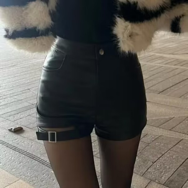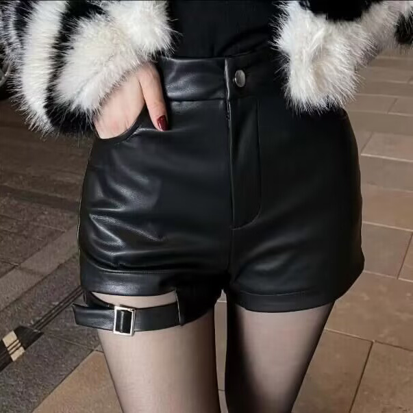 디자인 센스 틈새 빈 버클 PU 가죽 반바지 여성의 가을과 겨울 우아한 슬림 핏 슬리밍 블랙 바지 5158스토어 가기