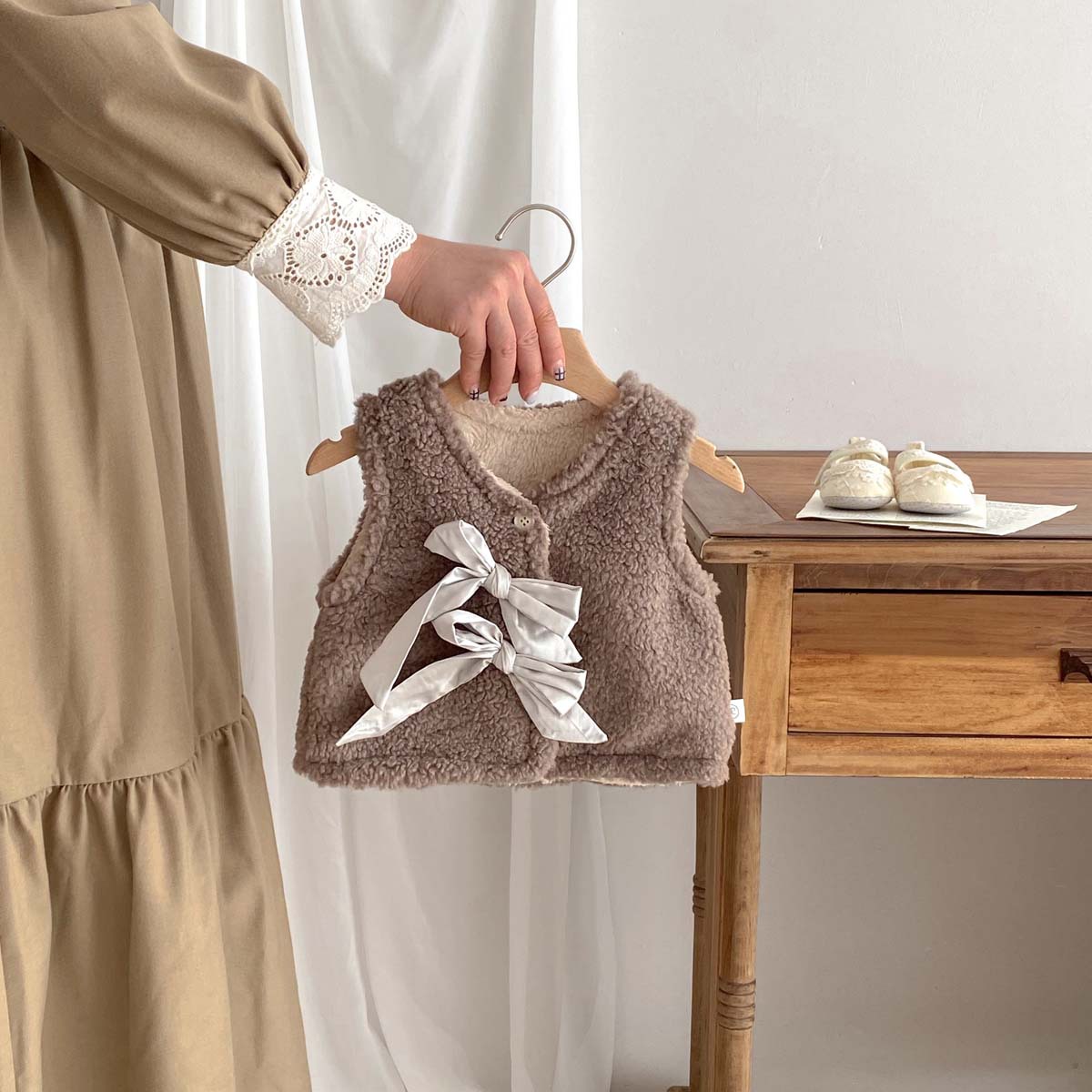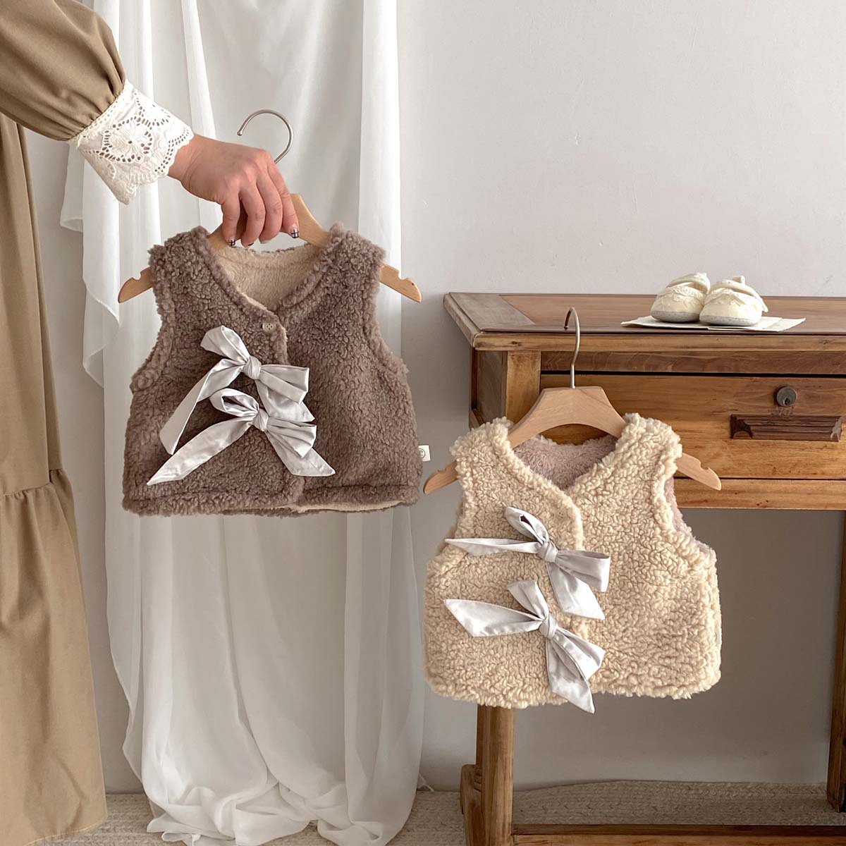 ins 한국판 가을 겨울 양면 벨벳 보온 조끼 여아용 플러스 벨벳 리본 두꺼운 양털 조끼 중소형 아동용스토어 가기