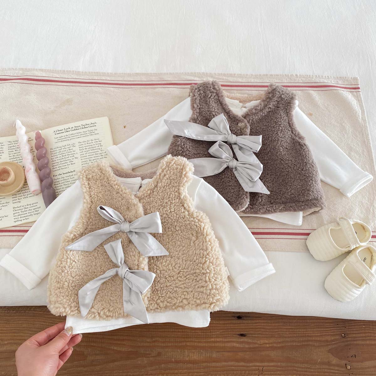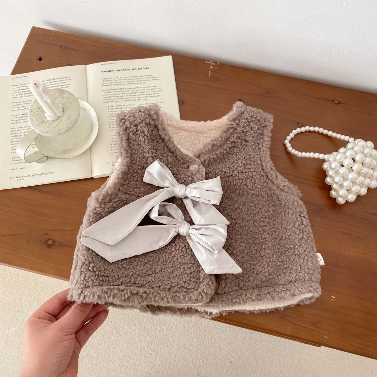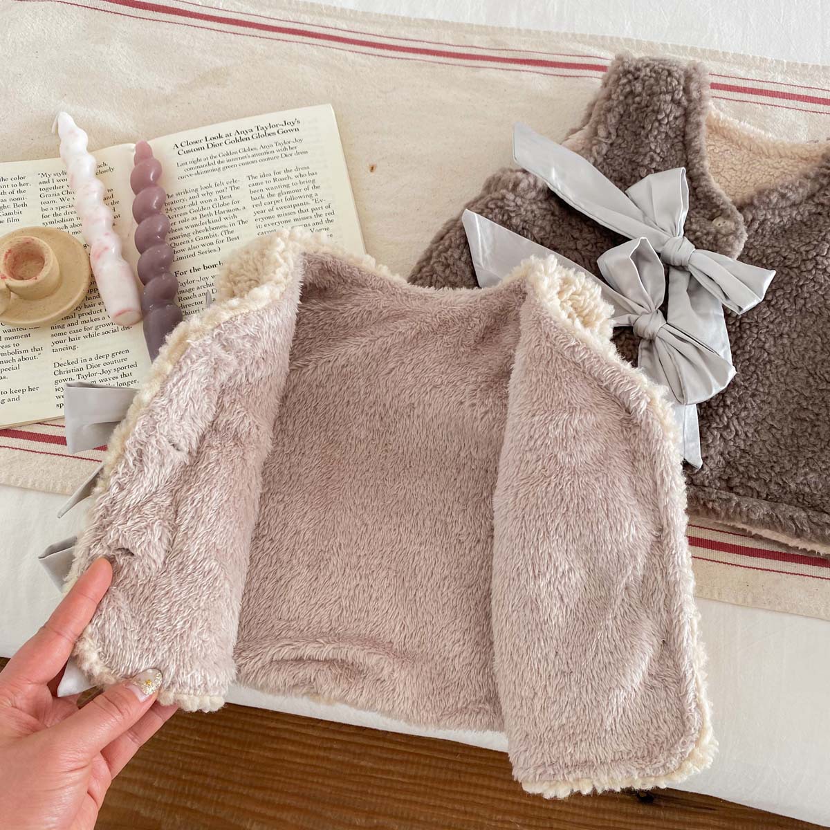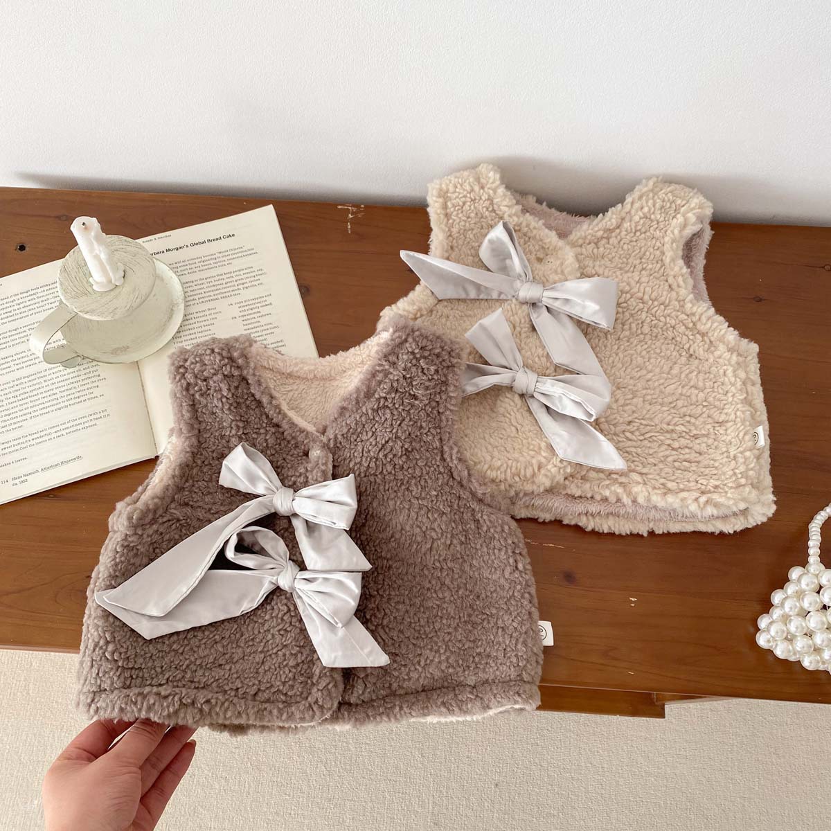 ins 한국판 가을 겨울 양면 벨벳 보온 조끼 여아용 플러스 벨벳 리본 두꺼운 양털 조끼 중소형 아동용