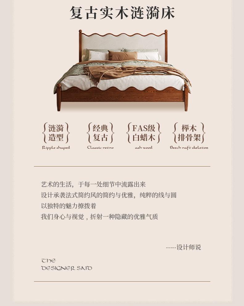 댄 팬 프랑스 크림 스타일 빈티지 침대 중간 스타일 큰 침대 작은 아파트 풀 더블 노르딕 애쉬 솔리드 우드 침대