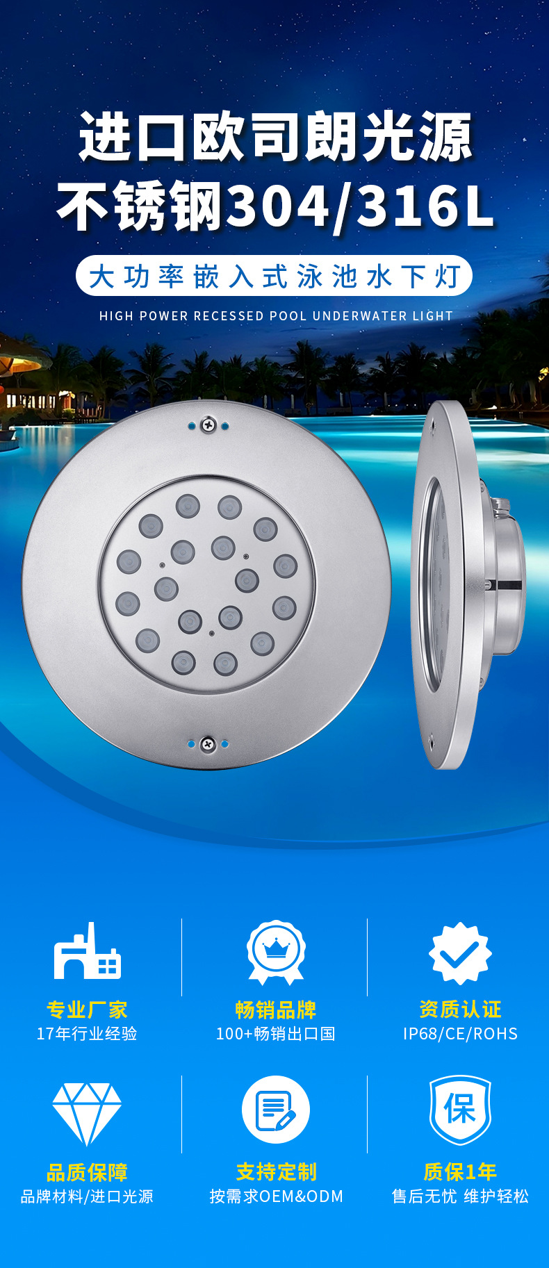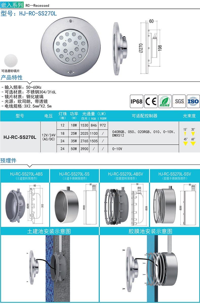 RGB 수영장 측벽 조명 매립형 숨김형 조명 LED 스테인리스 스틸 필름 온도조절 수영장 수중 조명 수중등