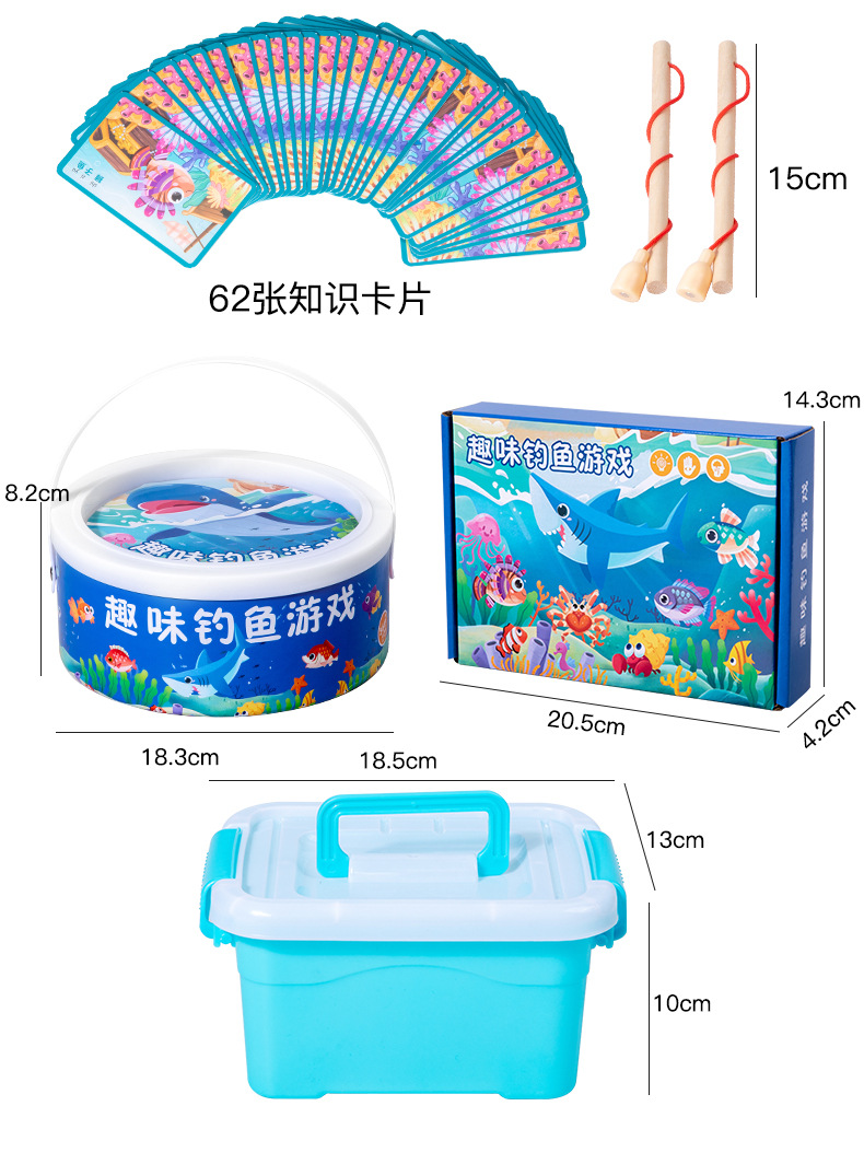62鱼4竿+场景图+62张卡片圆桶装 尺寸:18*18*8cm 重量:0.55KG 装箱数:54桶 箱规:56*56*50cm 重量:31kg
