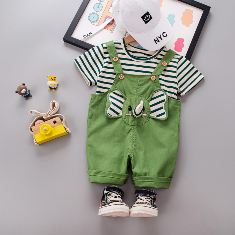 어린이 의류 2024 새로운 여름 소년 소녀 코끼리 서스펜더 바지 스트라이프 티셔츠 바지 투피스 세트 어린이 세트 패션스토어 가기