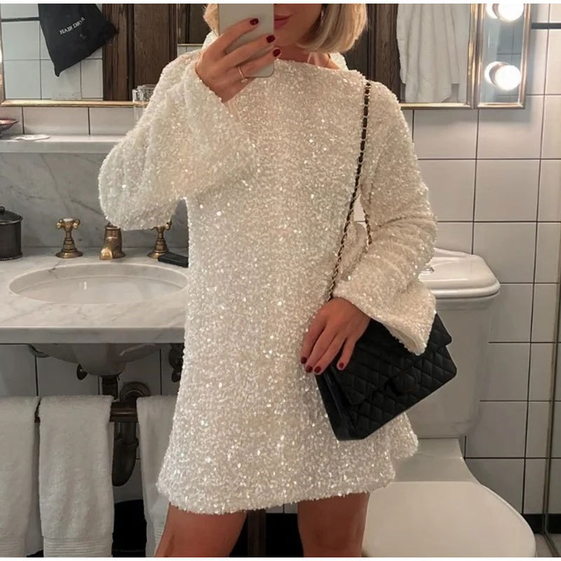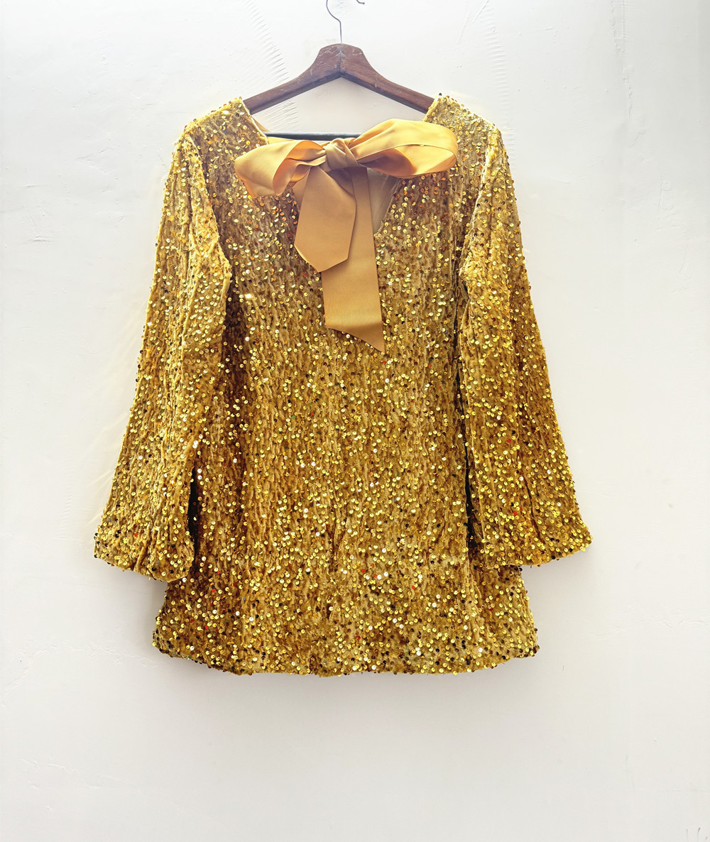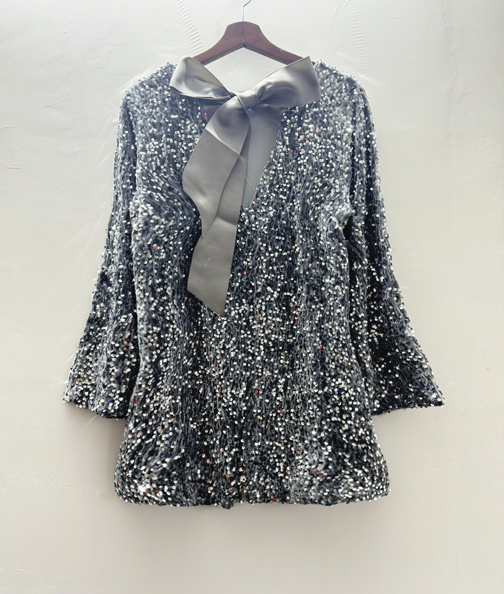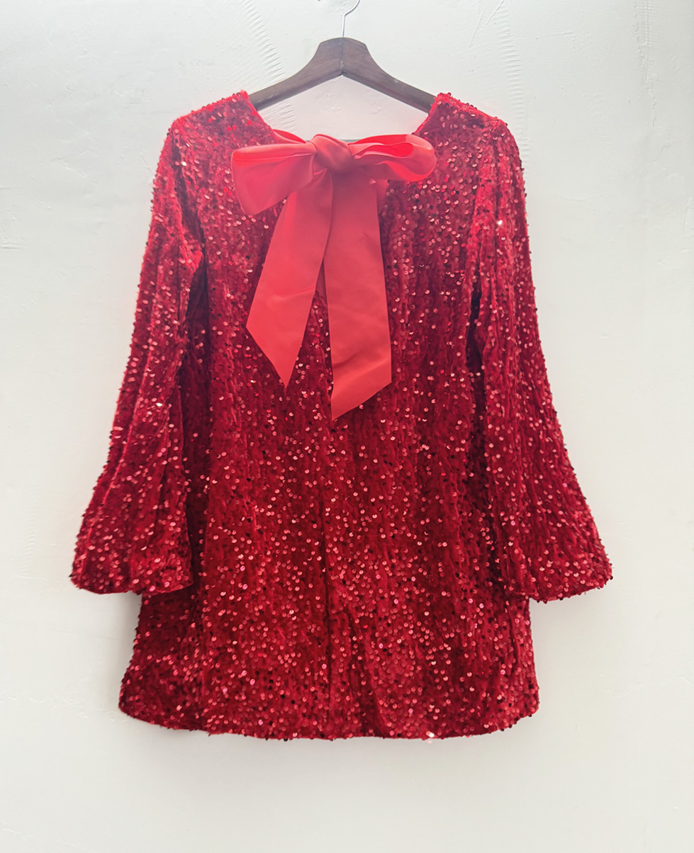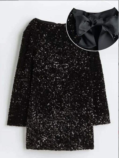 2023년 신상 유럽 및 미국 스타일 라운드넥 긴팔 루즈핏 큰 사이즈 스팽글 비즈 백리스 리본 원피스스토어 가기