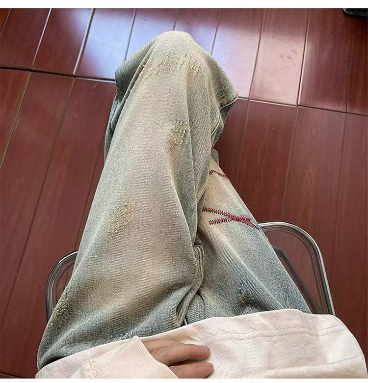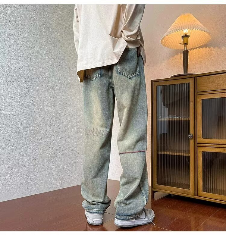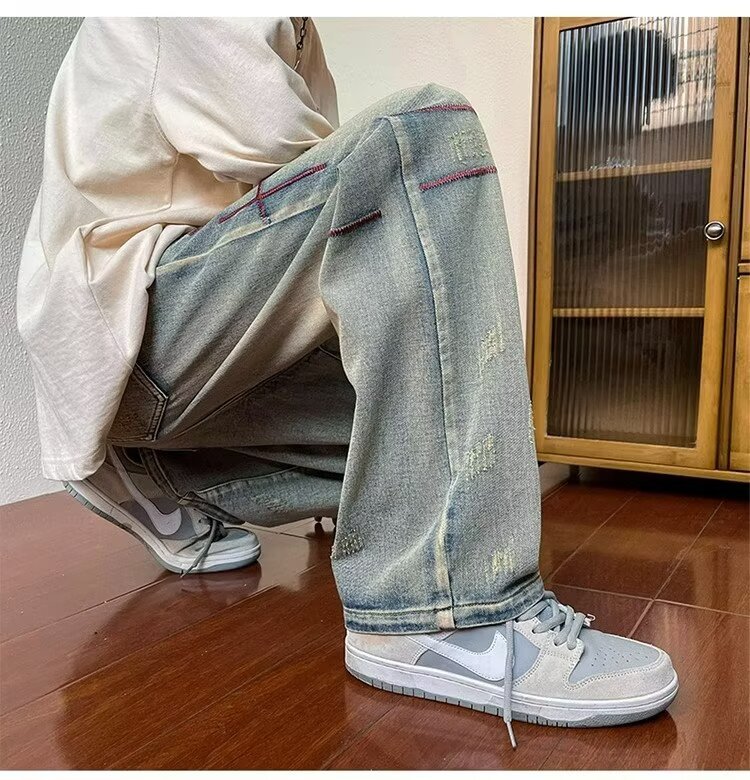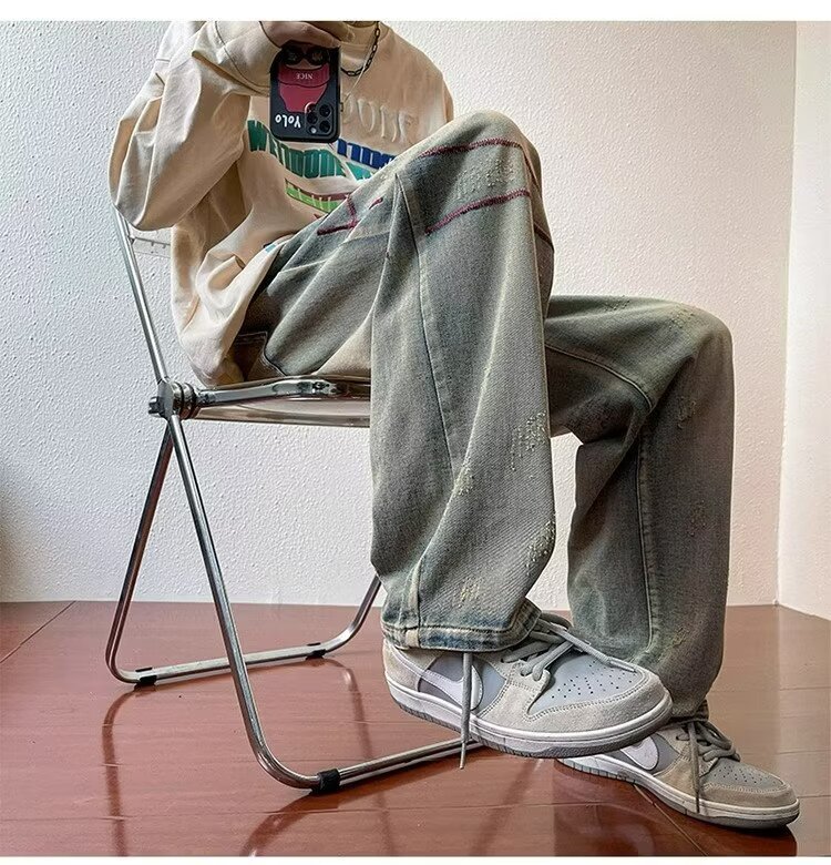 2024 봄과 가을 새로운 청바지 남성용 스트레이트 드레이핑 패션 브랜드 Pu Shuai 캐주얼 미국 복고풍 느슨한 바지스토어 가기