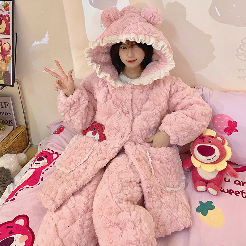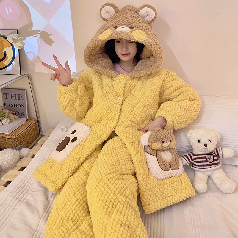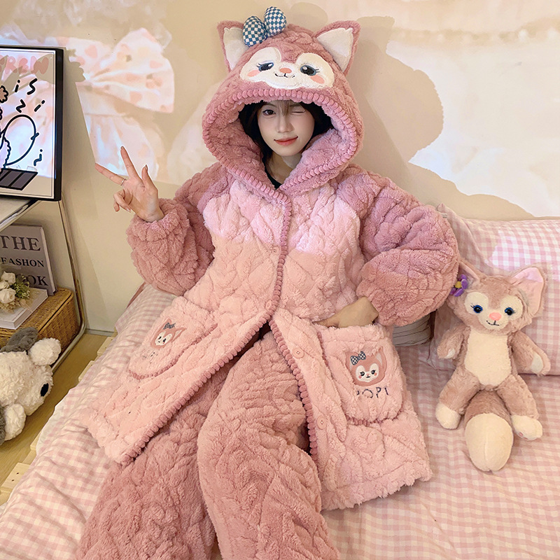 겨울 산호 양털 3 층 퀼트 파자마 여성 기모 두꺼운 만화 후드 소녀의 18 세 고등학생 가정 옷