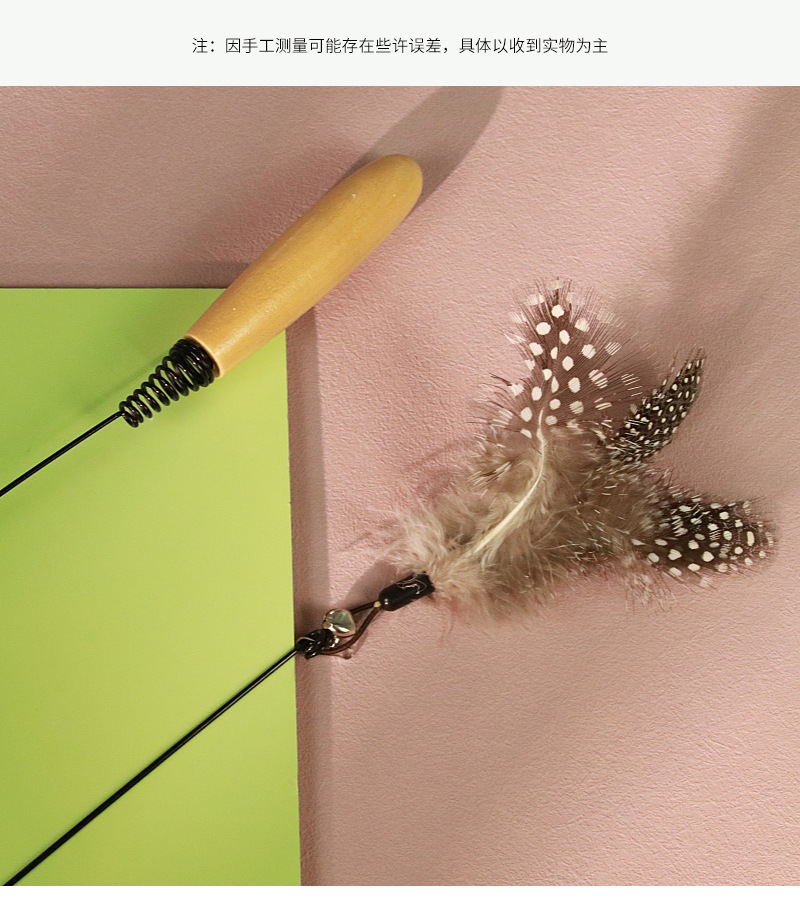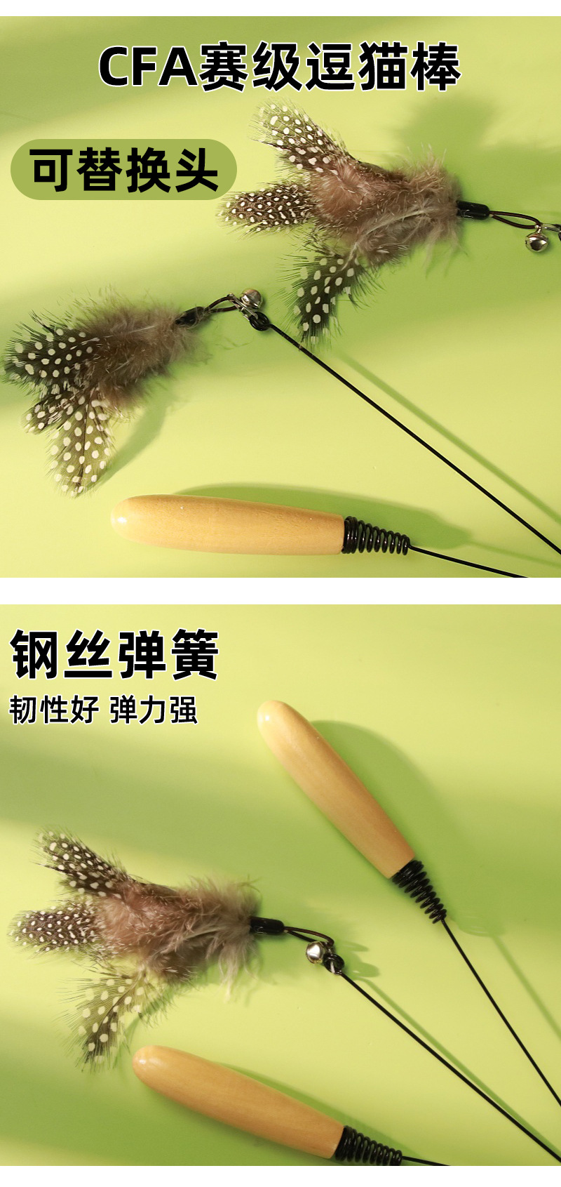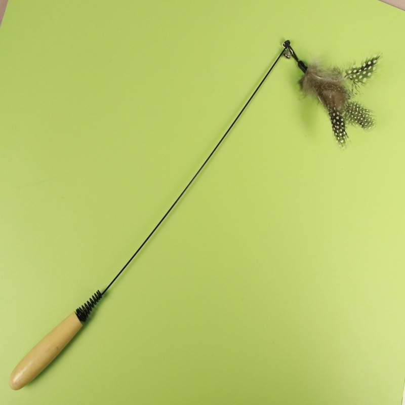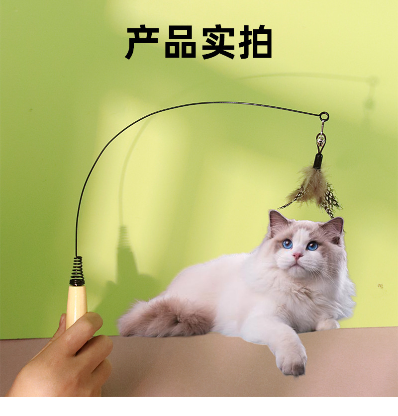 재미있는 고양이 장난감 제조 업체 도매 단단한 나무 손잡이 강철 와이어 봄 고양이 레버 교체 가능한 깃털 벨 소리 고양이 스틱