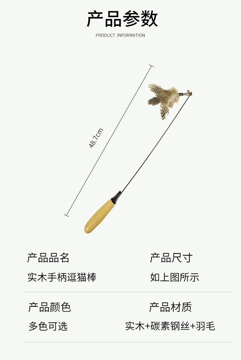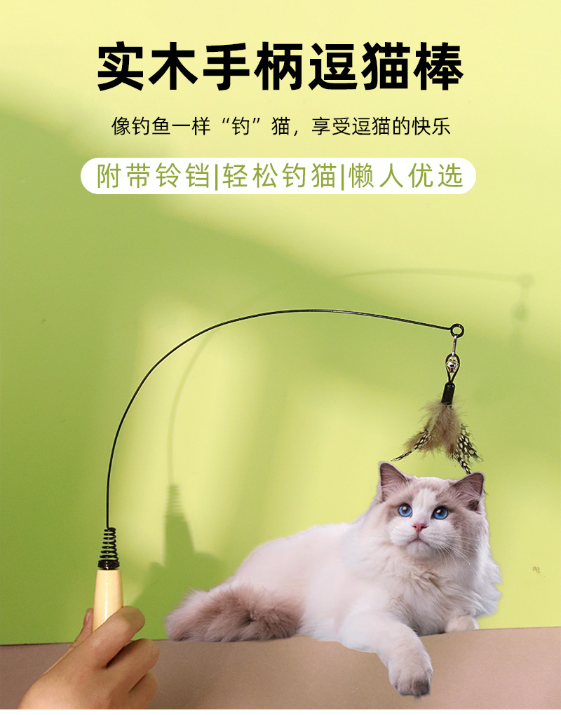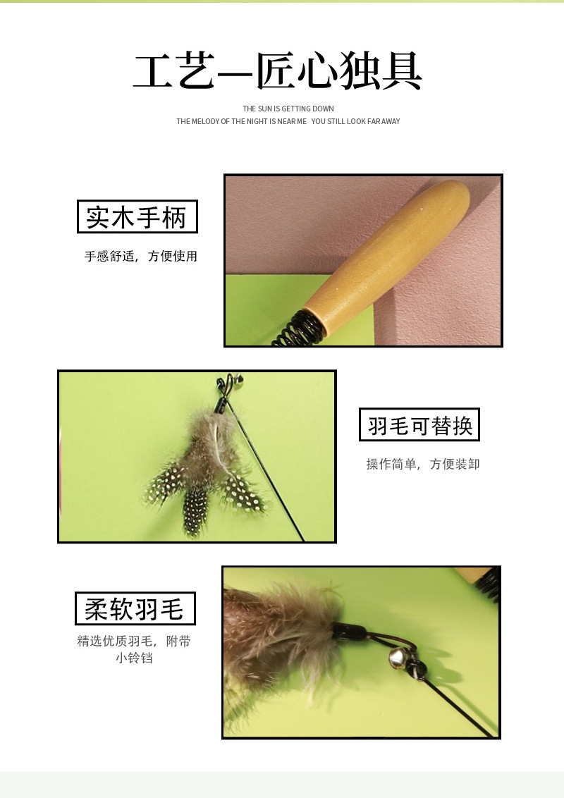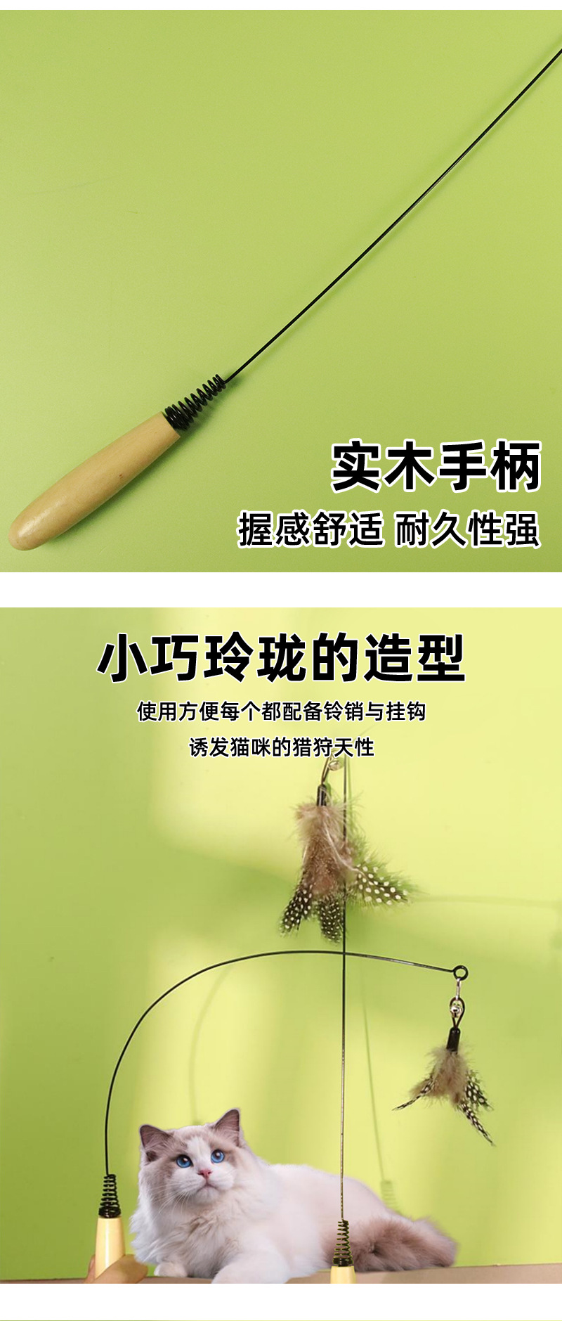 재미있는 고양이 장난감 제조 업체 도매 단단한 나무 손잡이 강철 와이어 봄 고양이 레버 교체 가능한 깃털 벨 소리 고양이 스틱