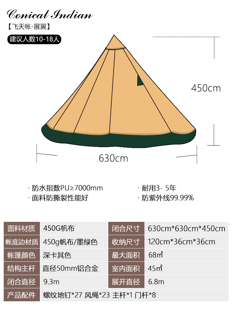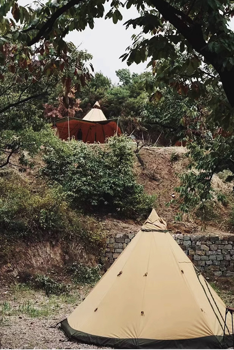 목재 야외 쉼터 캠핑용 두꺼운 캔버스 플라잉 텐트 캠핑 피라미드 인디언 텐트 바베큐 방수