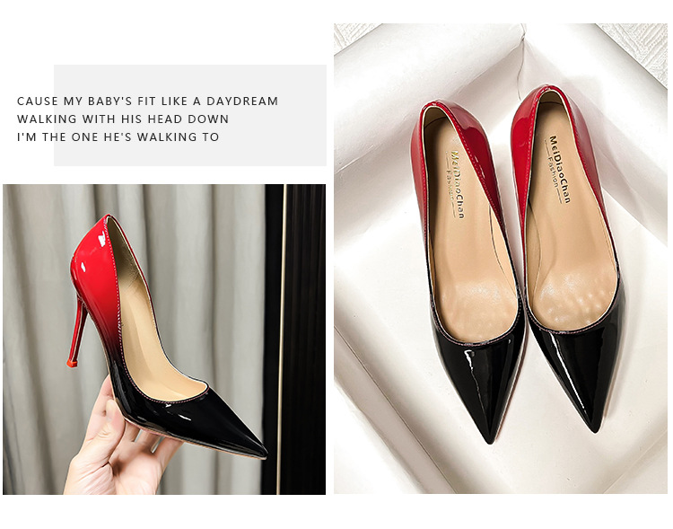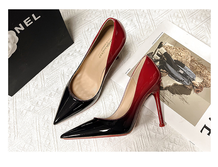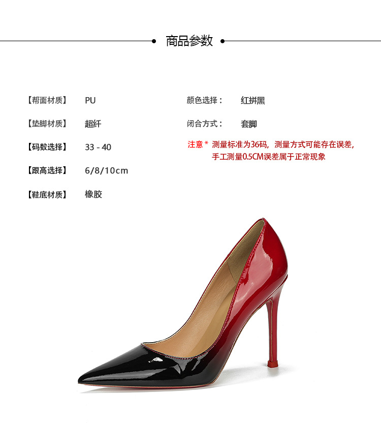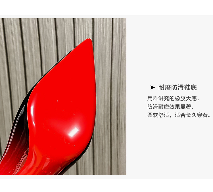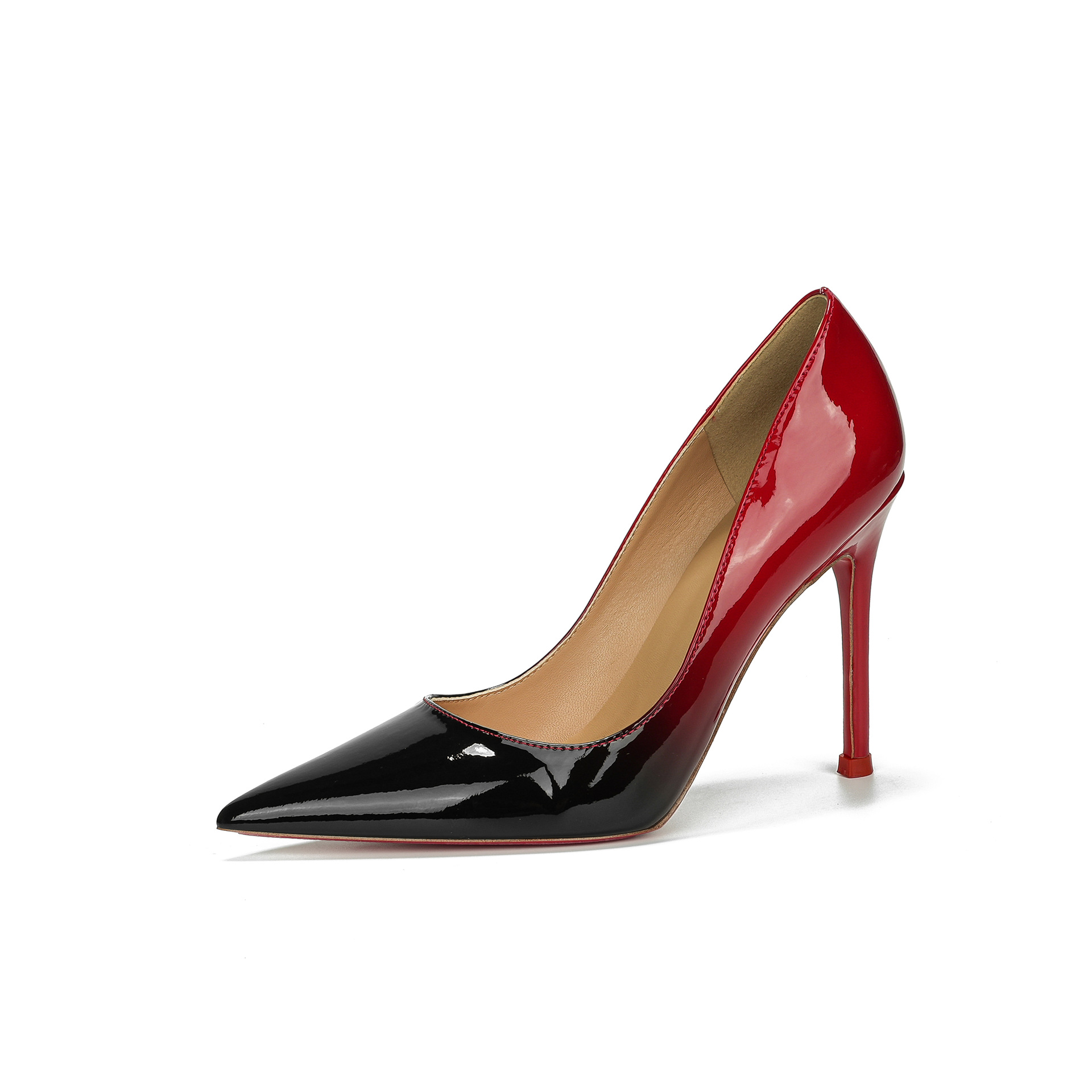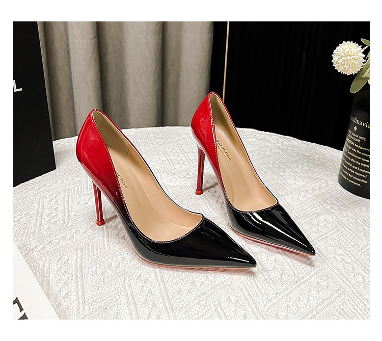 블랙과 레드 그라데이션 레드 바닥 스틸레토 힐, 여성스럽고 다재다능한 전문가용 뾰족코 나이트클럽 유혹 슈즈스토어 가기