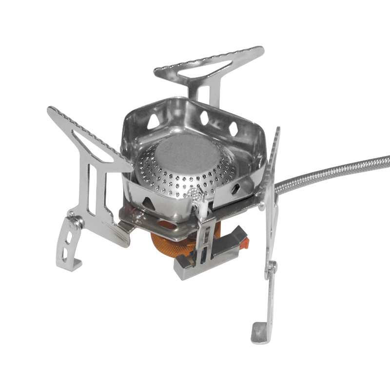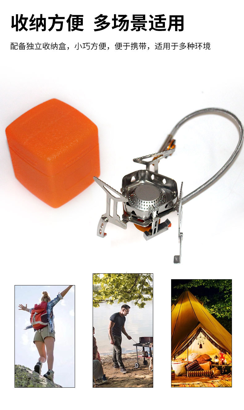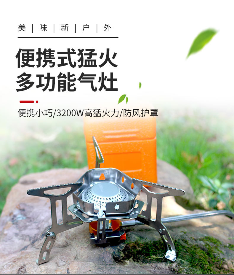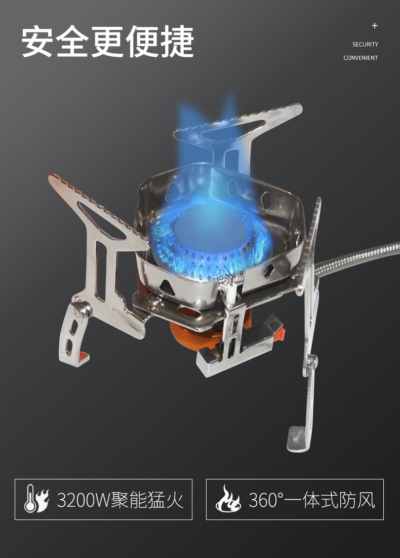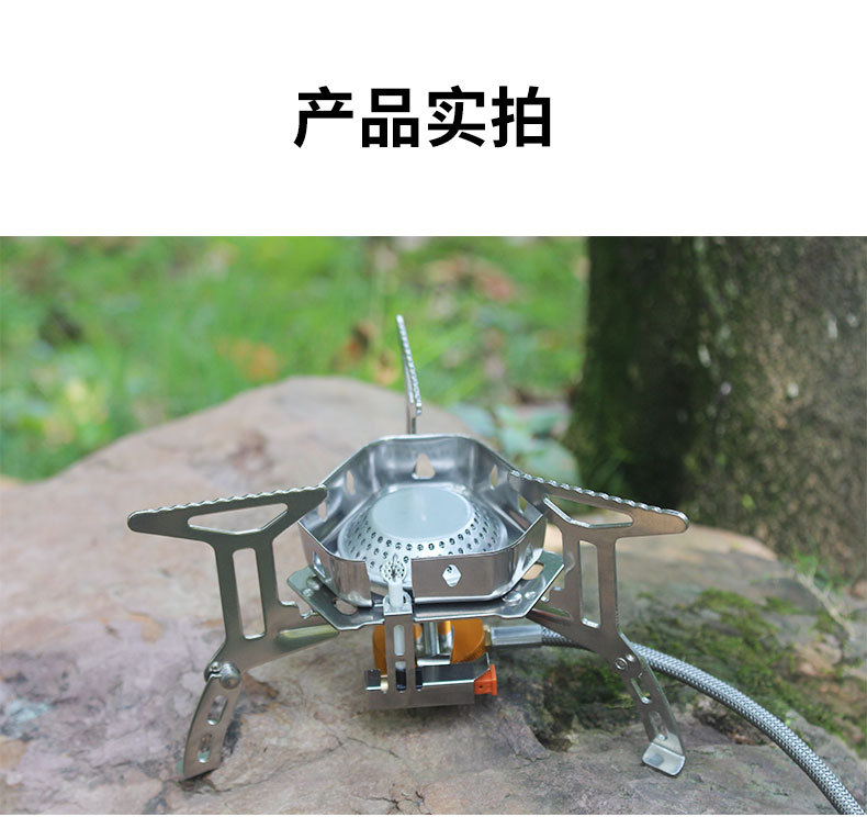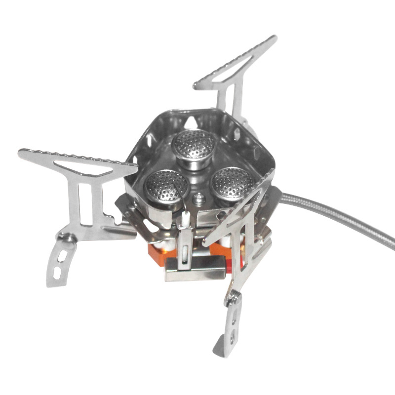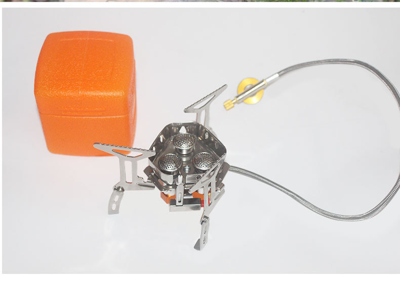 튜브가 있는 캠핑 스토브, 작고 휴대성이 뛰어난 3구 스토브, 고화력 야외 물 끓이는 스토브, 라벨이 있는 캠핑 용품스토어 가기