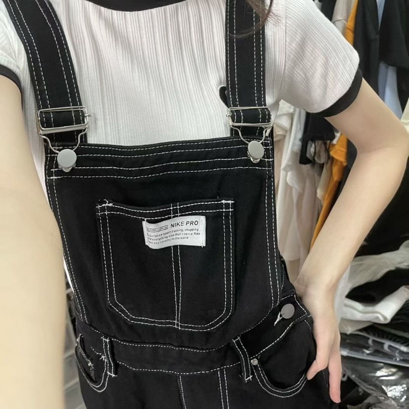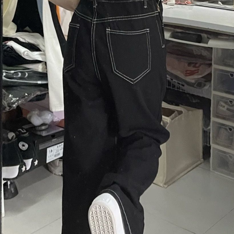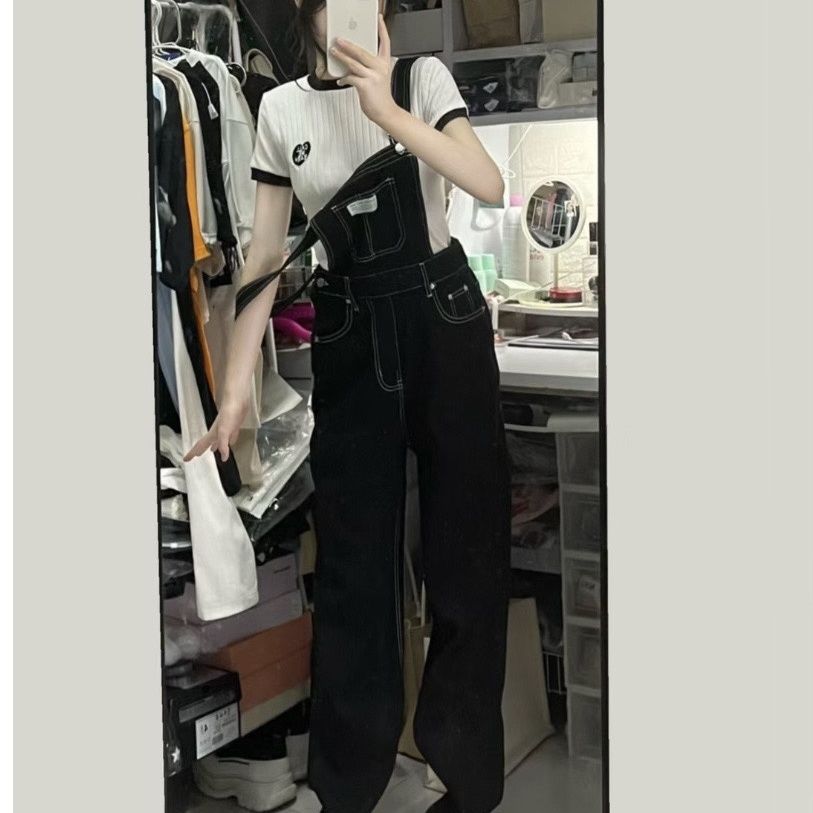 미국 복고풍 하이 허리 데님 서스펜더 바지 2024 봄 신학생 느슨한 스트레이트 슬리밍 걸레 바지스토어 가기