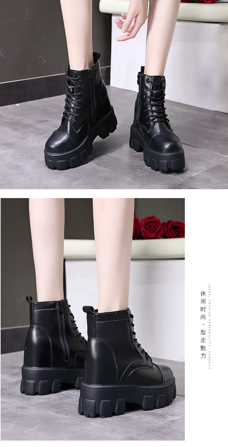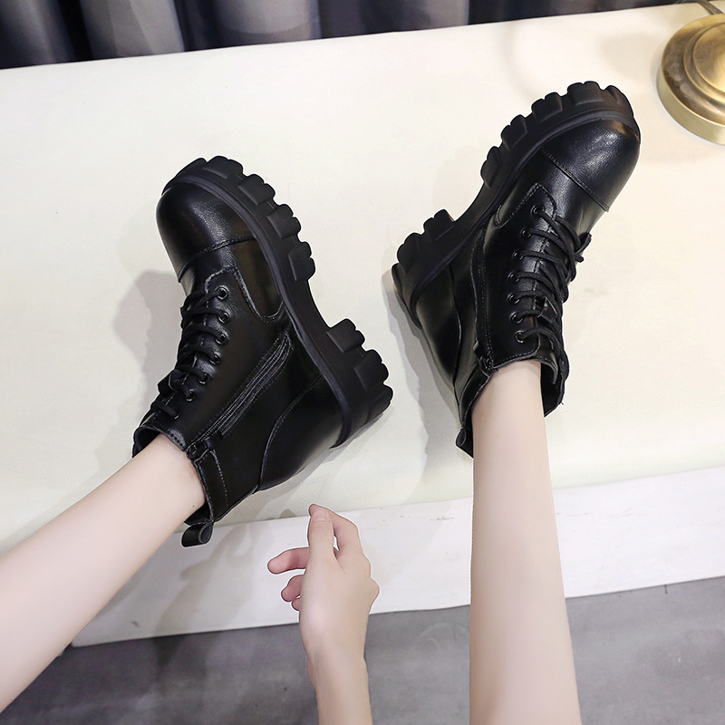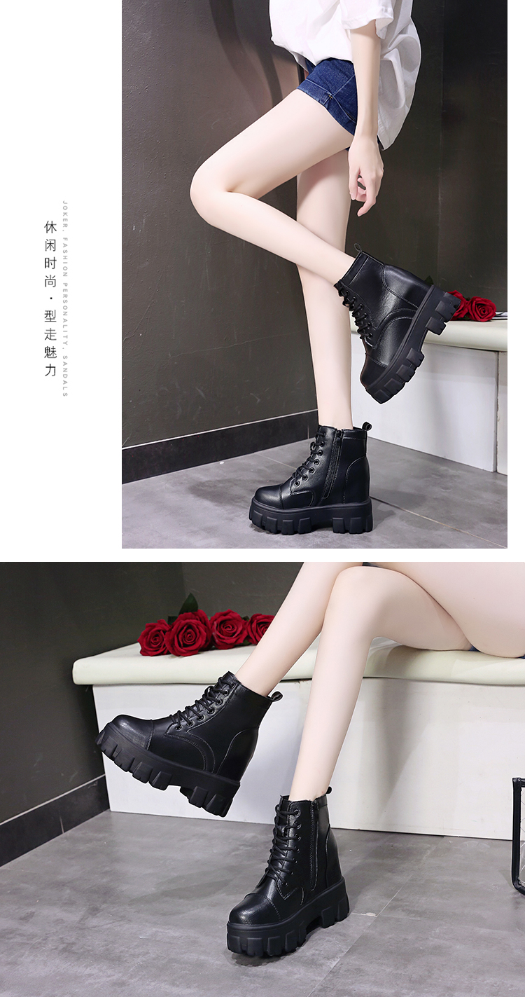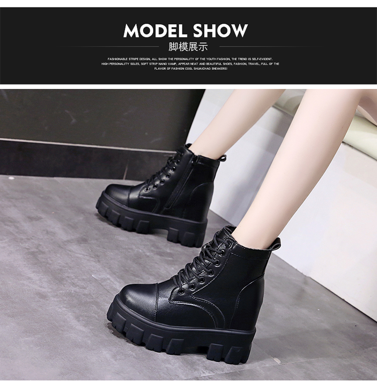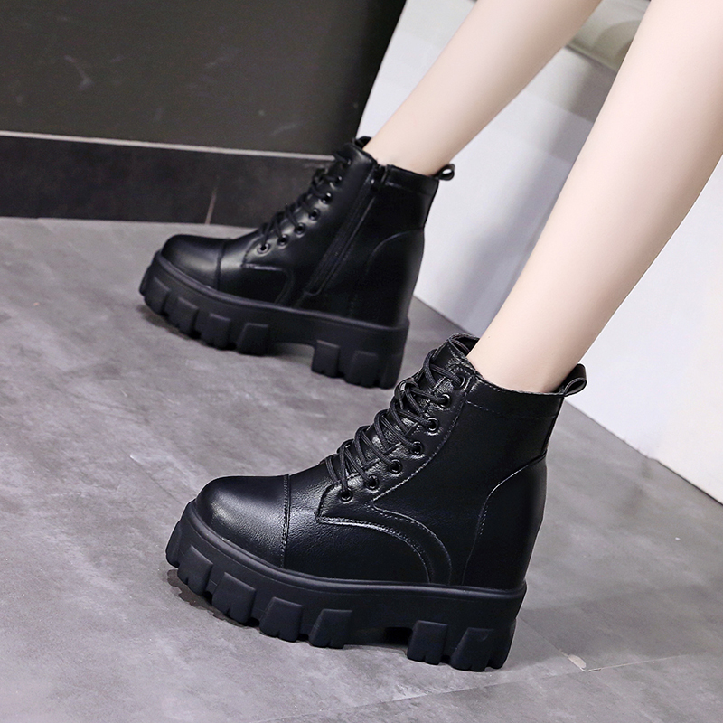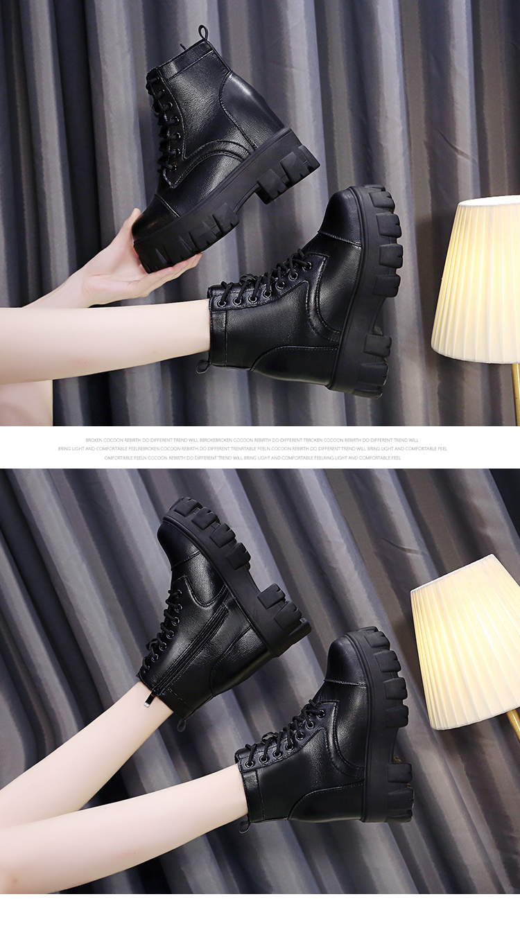 마틴 부츠 여성 10cm 내부 높이 여성 신발 2024 가을 및 겨울 새로운 영국 스타일 짧은 부츠 두꺼운 바닥 쐐기 블랙 가죽 부츠스토어 가기